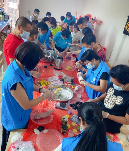 在月饼DIY制作环节,社工把做月饼的制作流程讲解了一遍,听了社工的讲解,志愿者和残障人士开始一个个步骤地学着做,一边相互探讨着做法,一边专心地揉面团、包馅。经过一个多小时的努力,一个个冰皮月饼展现在眼前,满满都是成就感。