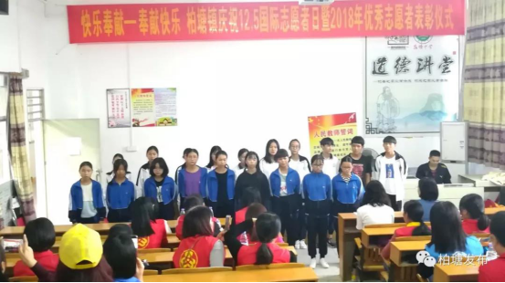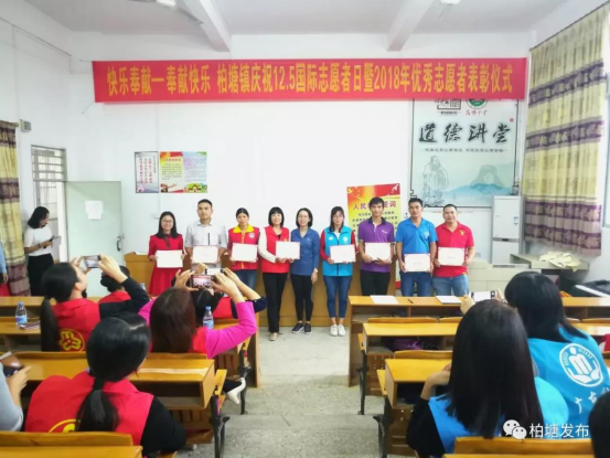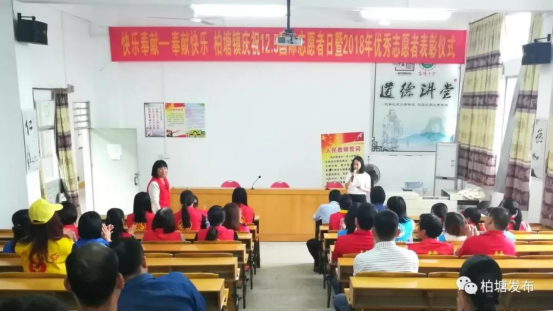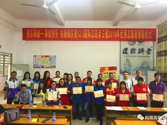 12月5日,是国际志愿者日。为了弘扬奉献社会、关爱他人的高尚精神,今天下午,柏塘镇在柏塘中学举行了庆祝“12·5”国际志愿者日暨2018年优秀志愿者表彰仪式。镇党委委员梁敏丽同志、镇妇联、团镇委、柏塘镇各志愿服务团体以及柏塘中学师生代表共50人参加了活动。