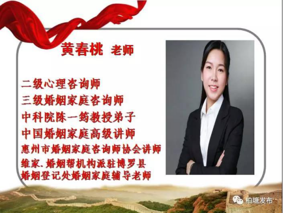 活动邀请了中国婚姻家庭高级讲师黄春桃老师,惠州市婚姻家庭咨询师高级讲师心悦老师向参加讲座的人员普及了《中华人民共和国婚姻法》、《反家暴法》、《婚姻爱的能力提升》等相关法律知识和调适婚姻家庭关系的方法。两位讲师现场解答了对于婚姻家庭关系中的相关法律问题及相关家庭知识疑问,并呼吁大家维系良好的婚姻家庭关系,营造良好家风。本次活动进一步提升与会人员的法律意识,对弘扬良好家风,推动柏塘文明乡风建设发挥了积极作用。