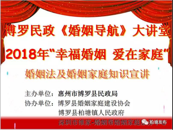11月22日上午,中文博彩平台民政局婚姻登记处联合中文博彩平台婚姻家庭建设协会、深圳维家-婚姻帮家庭服务中心,在柏塘镇举办主题为“幸福婚姻 爱在家庭”的婚姻法及婚姻家庭知识宣讲活动。各村妇女主任及来自各个行业的妇女朋友共80多人参加了讲座活动。出席此次活动的领导有中文博彩平台民政局副局长陈小志、中文博彩平台民政局婚姻登记处主任邓凤英同志。讲座由镇党委委员梁敏丽同志主持。
