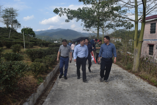 石岗村党支部书记、村委主任罗建强(右一)带领参观三棵松茶园