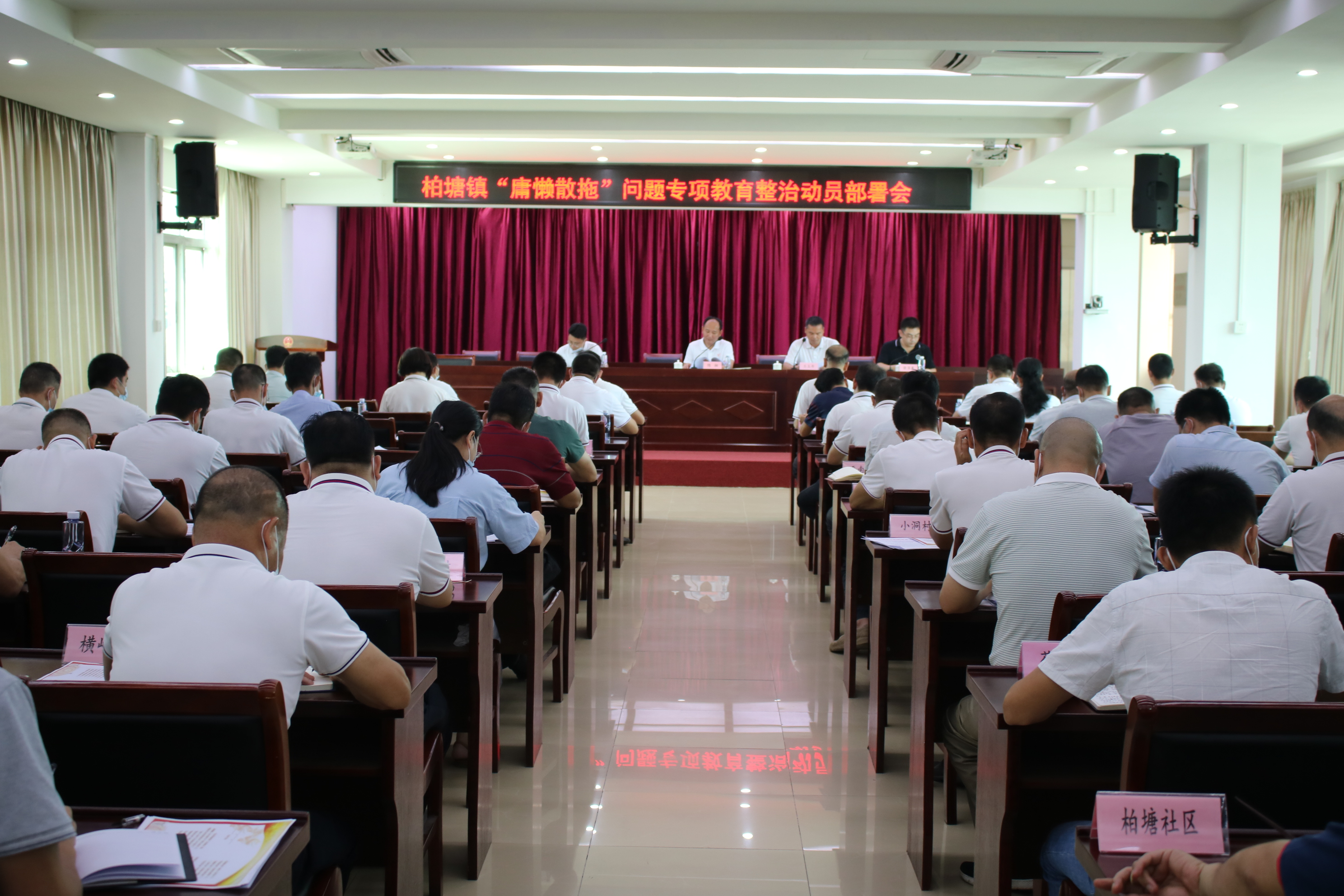 为加强干部队伍作风建设,8月3日下午,柏塘镇召开“庸懒散拖”问题专项教育整治动员部署会,镇领导班子和副科级以上干部、驻镇部门负责人、镇内设机构部门负责人、各村(社区)支部书记等人员参加会议,会议由镇党委书记陈湘主持。