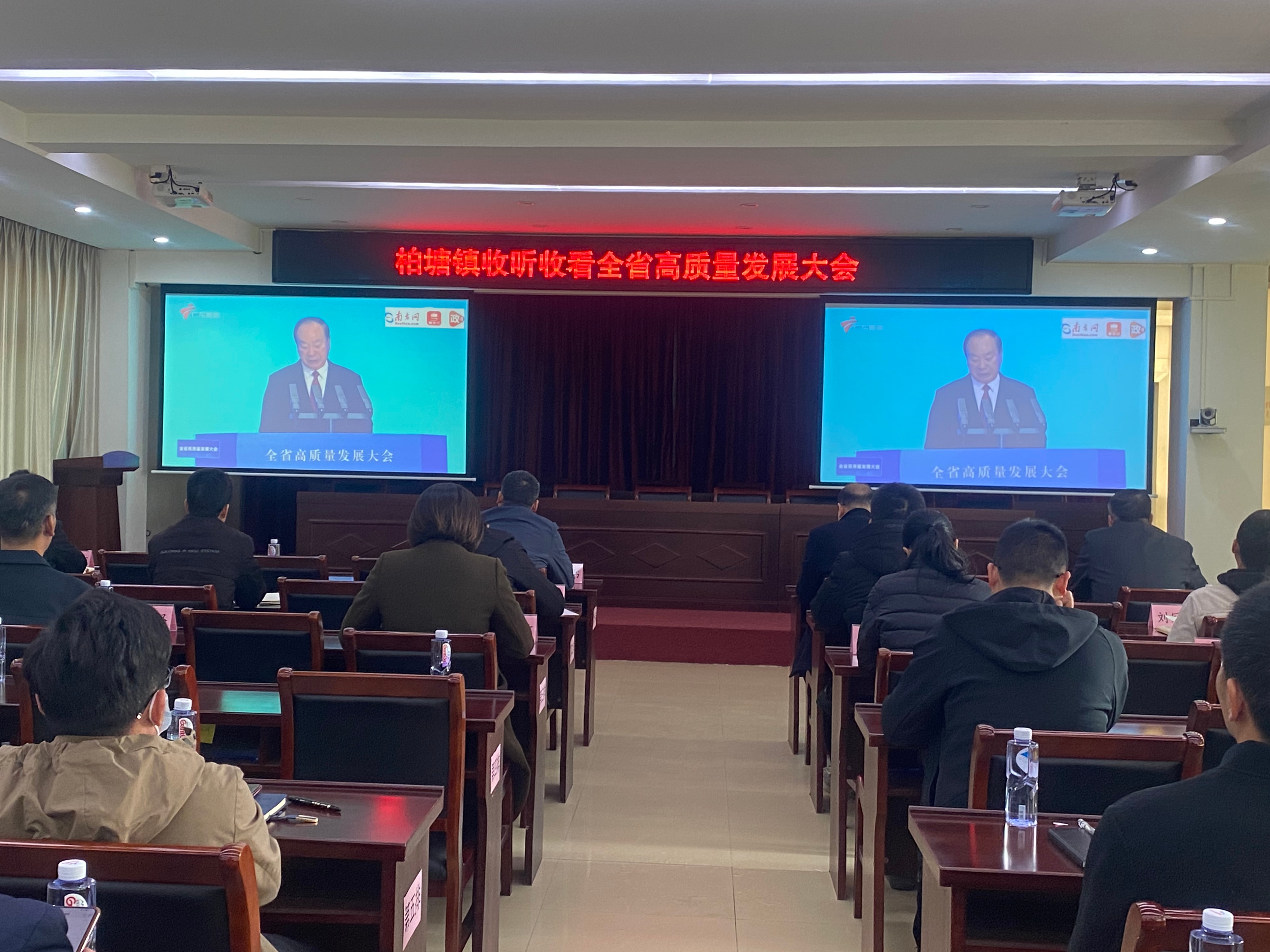 镇领导班子、各部门负责人在镇政府五楼收听收看全省高质量发展大会
