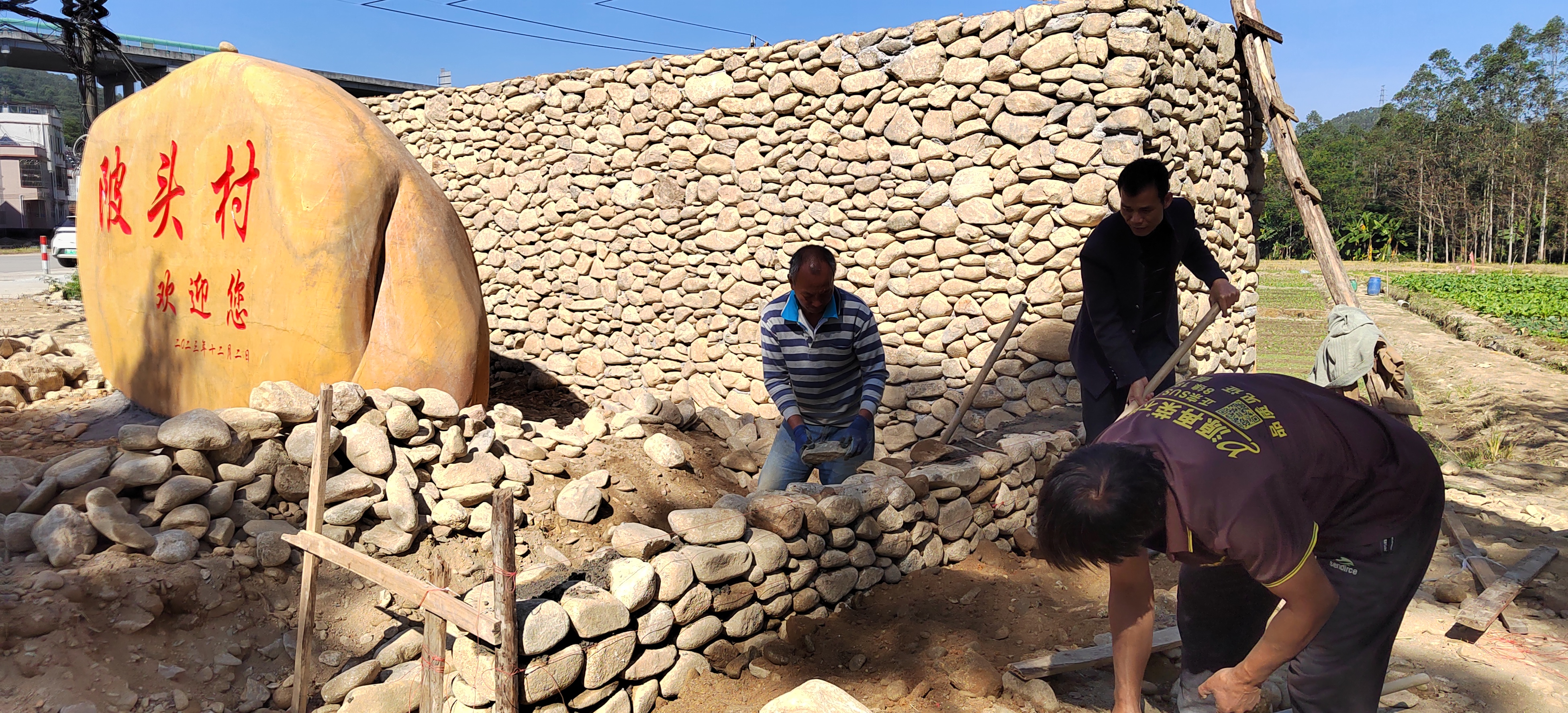 陂头村就地取材使用河道鹅卵石美化村口建设,群众自发前往助力