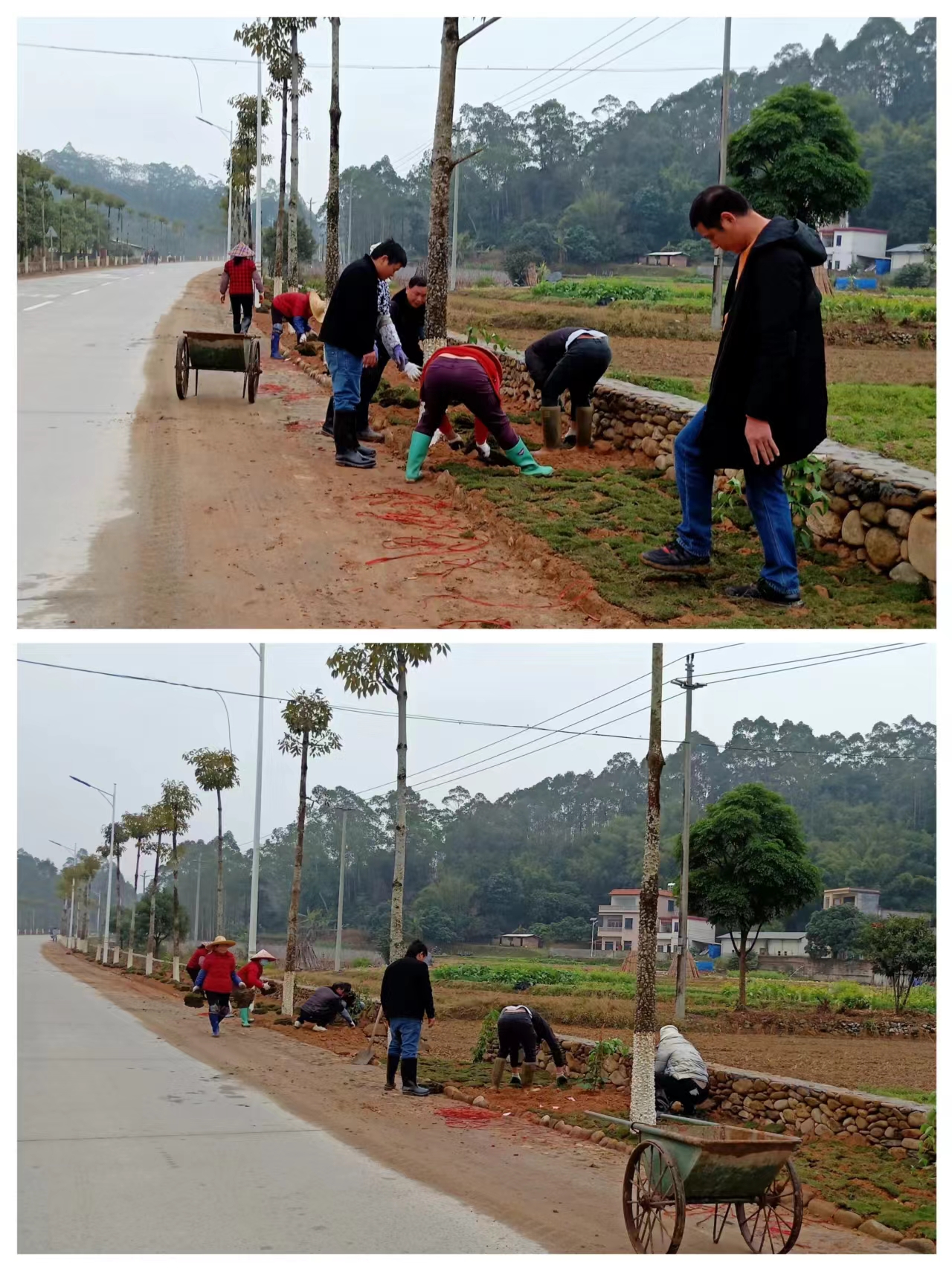 党员干部带领村民代表、保洁员利用周末时间种植草皮,齐心合力,绿化家园