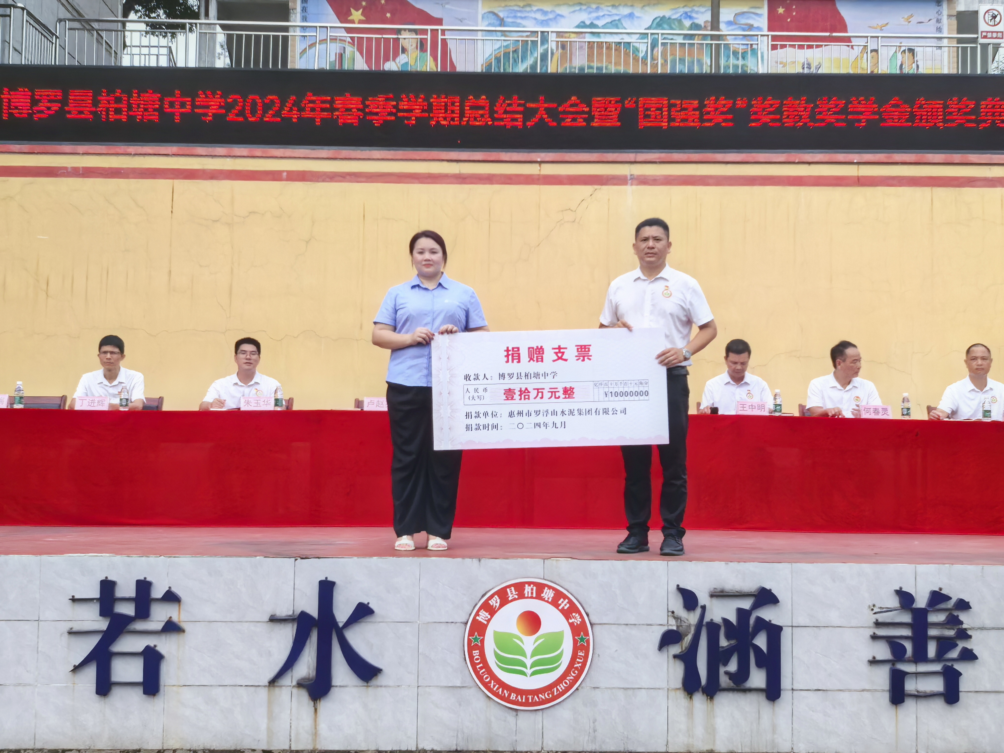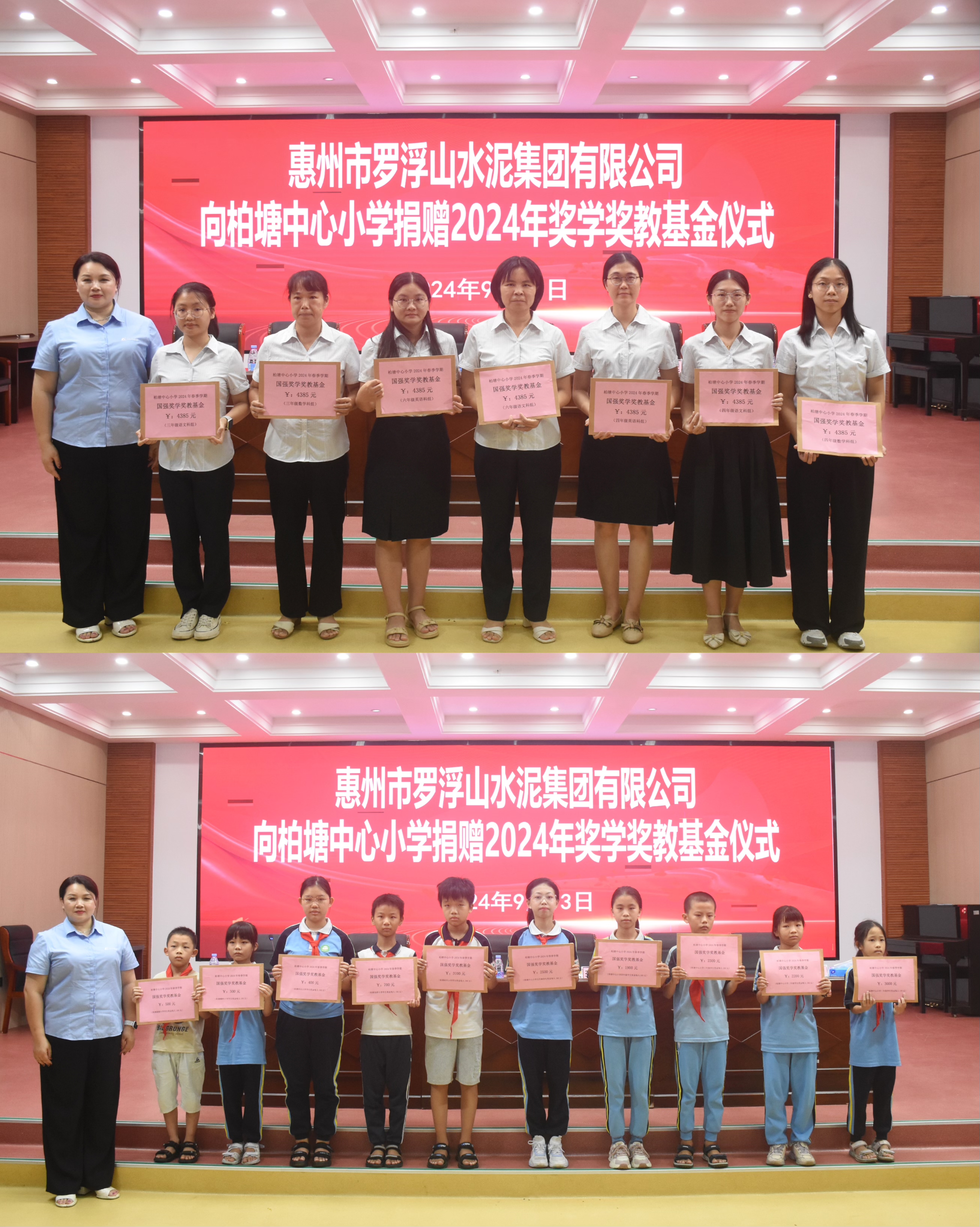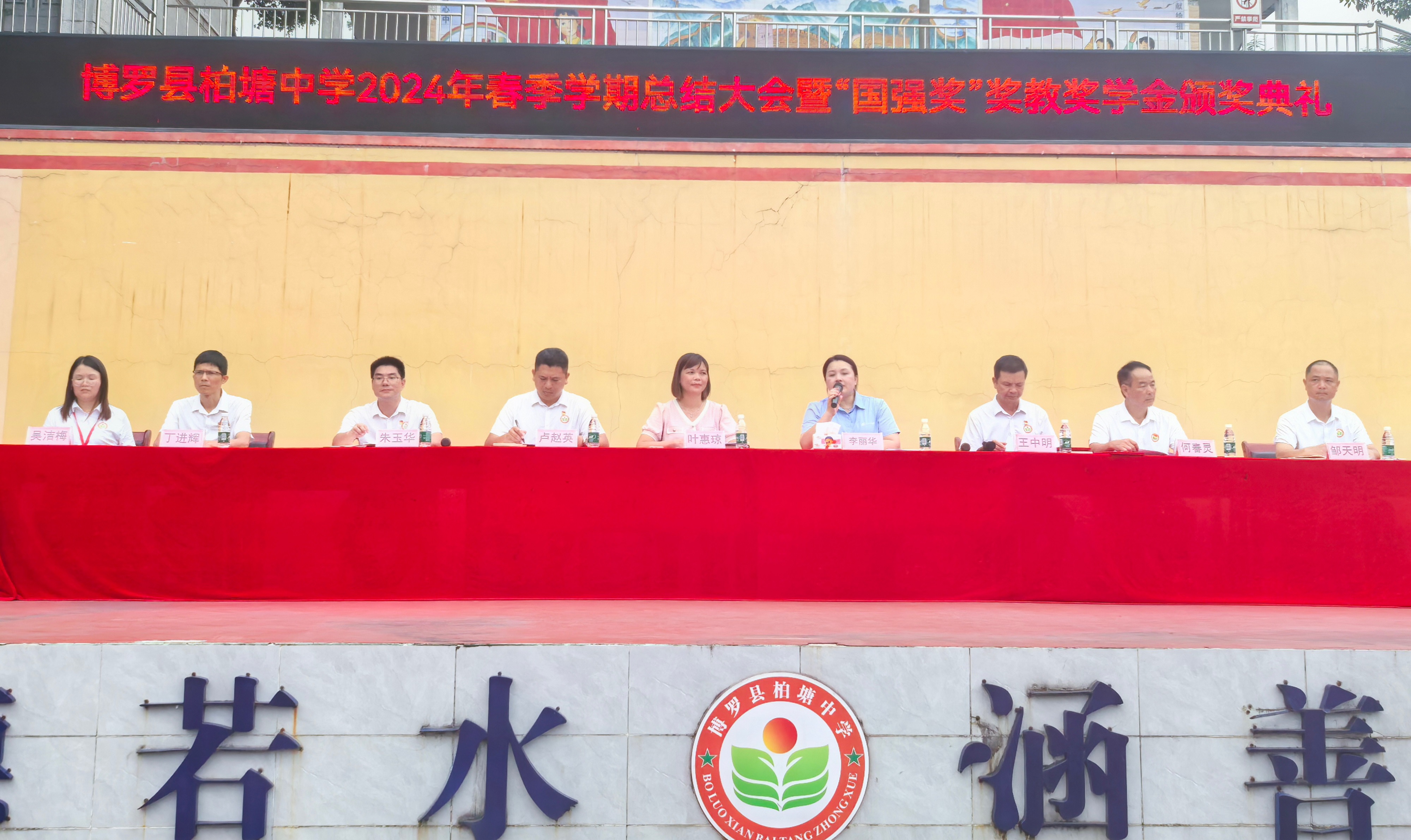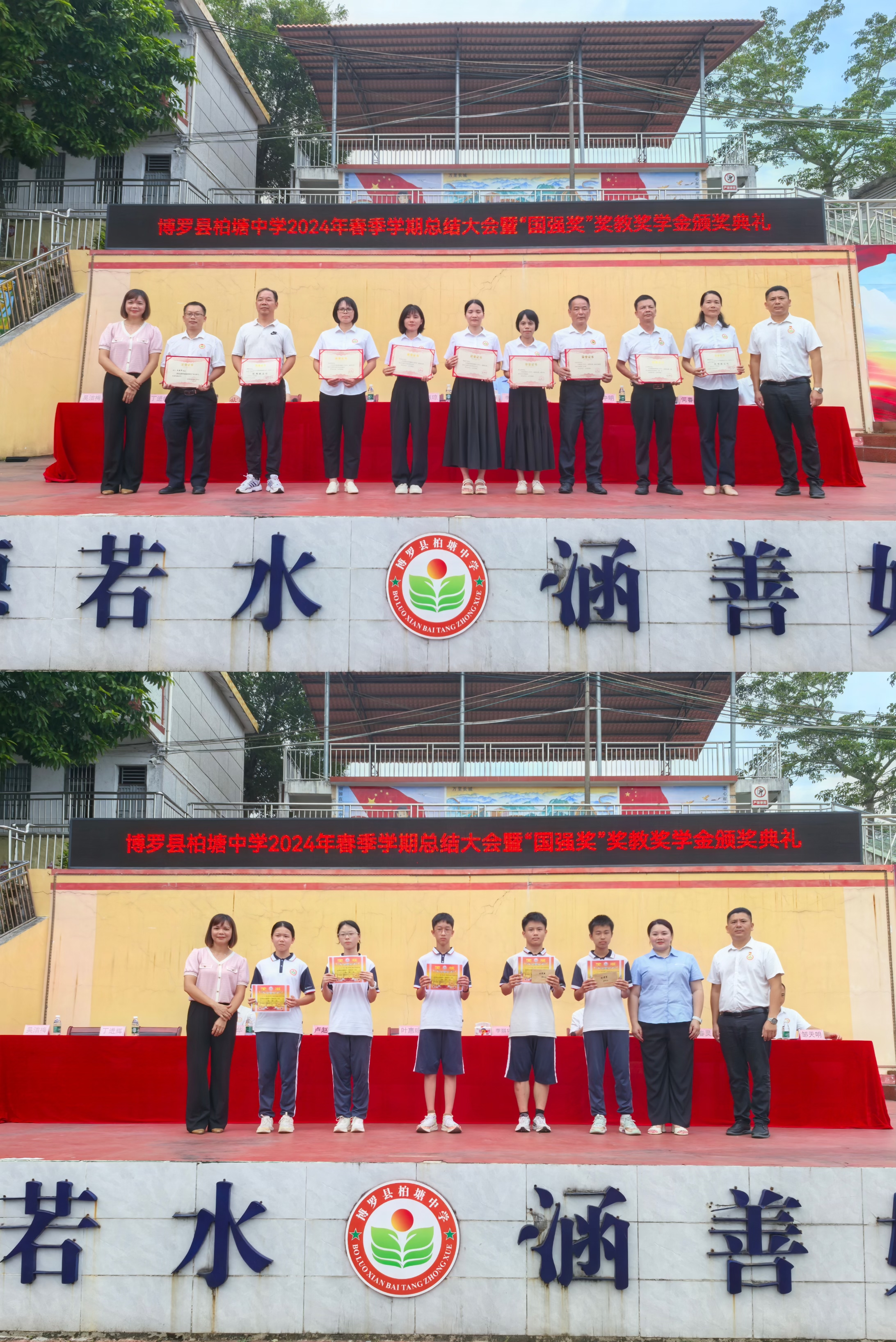 9月13日,柏塘镇柏塘中学、柏塘中心小学分别开展2024年国强奖学奖教表彰大会,柏塘镇副镇长叶惠琼、罗浮山水泥集团行政副总裁李丽华及两校师生代表参加表彰活动。