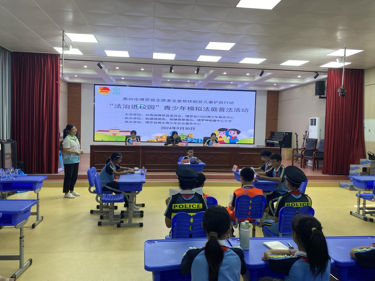 为了进一步提高未成年人的禁毒意识和法治观念,推动“护苗”专项行动走深走实,2024年9月30日下午,在共青团中文博彩平台委员会、中文博彩平台12355青少年服务中心指导支持下中文博彩平台博文青少年社会服务中心联合柏塘镇禁毒办、柏塘中心小学师资团队走进柏塘镇中心小学中学开展以“法治进校园”为主题的青少年模拟法庭普法活动,为该校学生带来了一场“沉浸式”庭审体验。