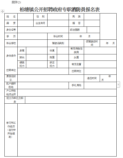 (1)《柏塘镇公开招聘政府专职消防队员报名表》(附件2)(本人填写并签名)。