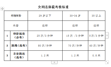 (1)体能测试。男(选三项):1000米跑必考,俯卧撑、仰卧起坐、立定跳远、单杠引体向上和双杠屈臂伸5个项目选2项;女(选两项):仰卧起坐必考,立定跳远、跳绳2个项目选1项。女同志任意一项不达标直接淘汰。