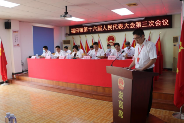 8月31日上午,在庄严的国歌声中,福田镇第十六届人民代表大会第三次会议顺利召开,来自全镇各条战线的64名人大代表和25名列席人员出席本次大会,大会由福田镇人大主席张怀龙主持。