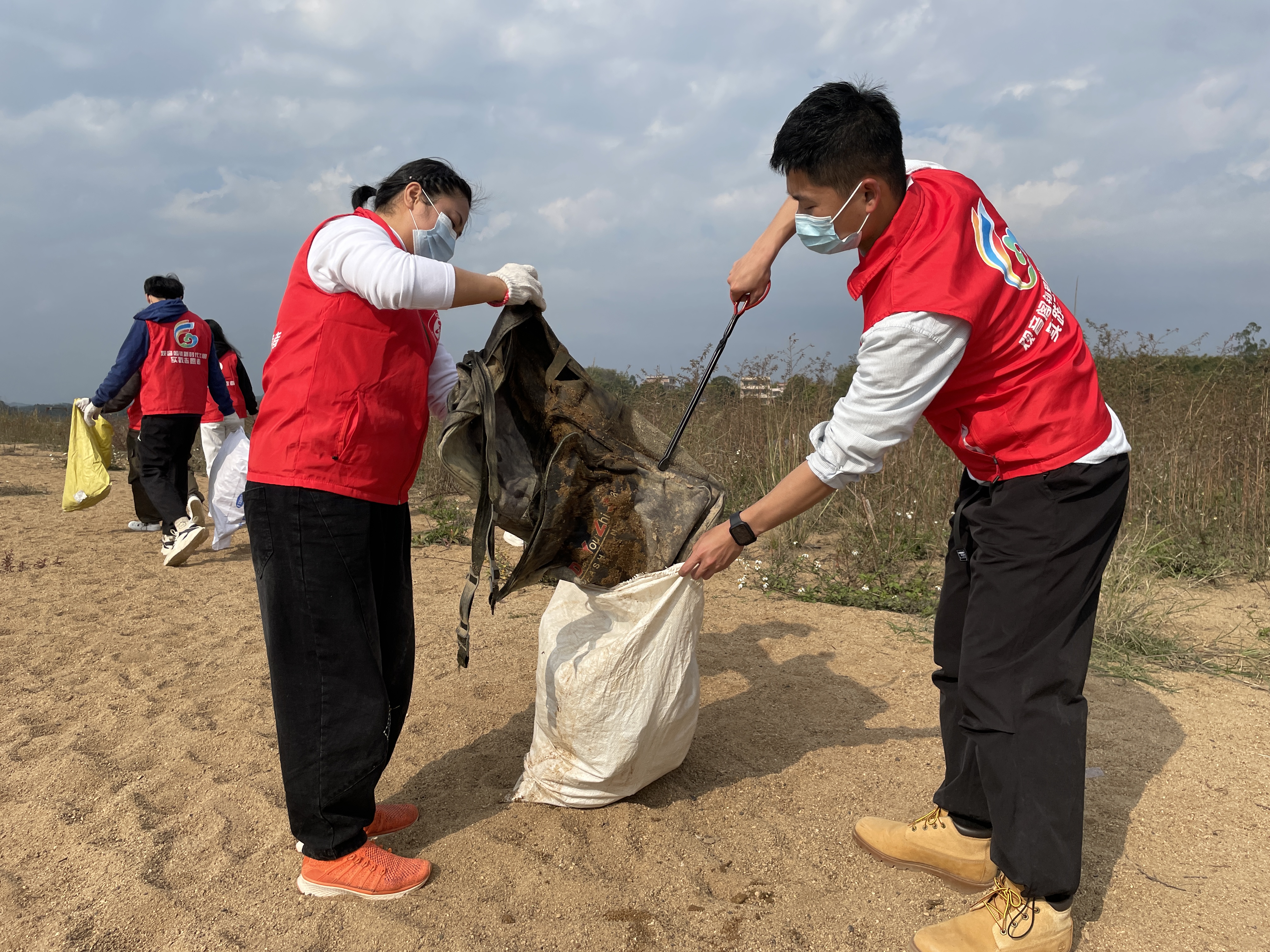灿烂的阳光下,志愿者们身穿志愿服务“红马甲”相继到达指定地点集合,手持钳子、垃圾袋等用具,沿着东江边路面和河周边捡起塑料袋、饮料瓶、废旧衣物等垃圾并细心装入袋中。他们分工协作、互相帮助,积极参与,在草丛间、沙堆里边走边找,全情投入,形成东江边的一道亮丽的风景。