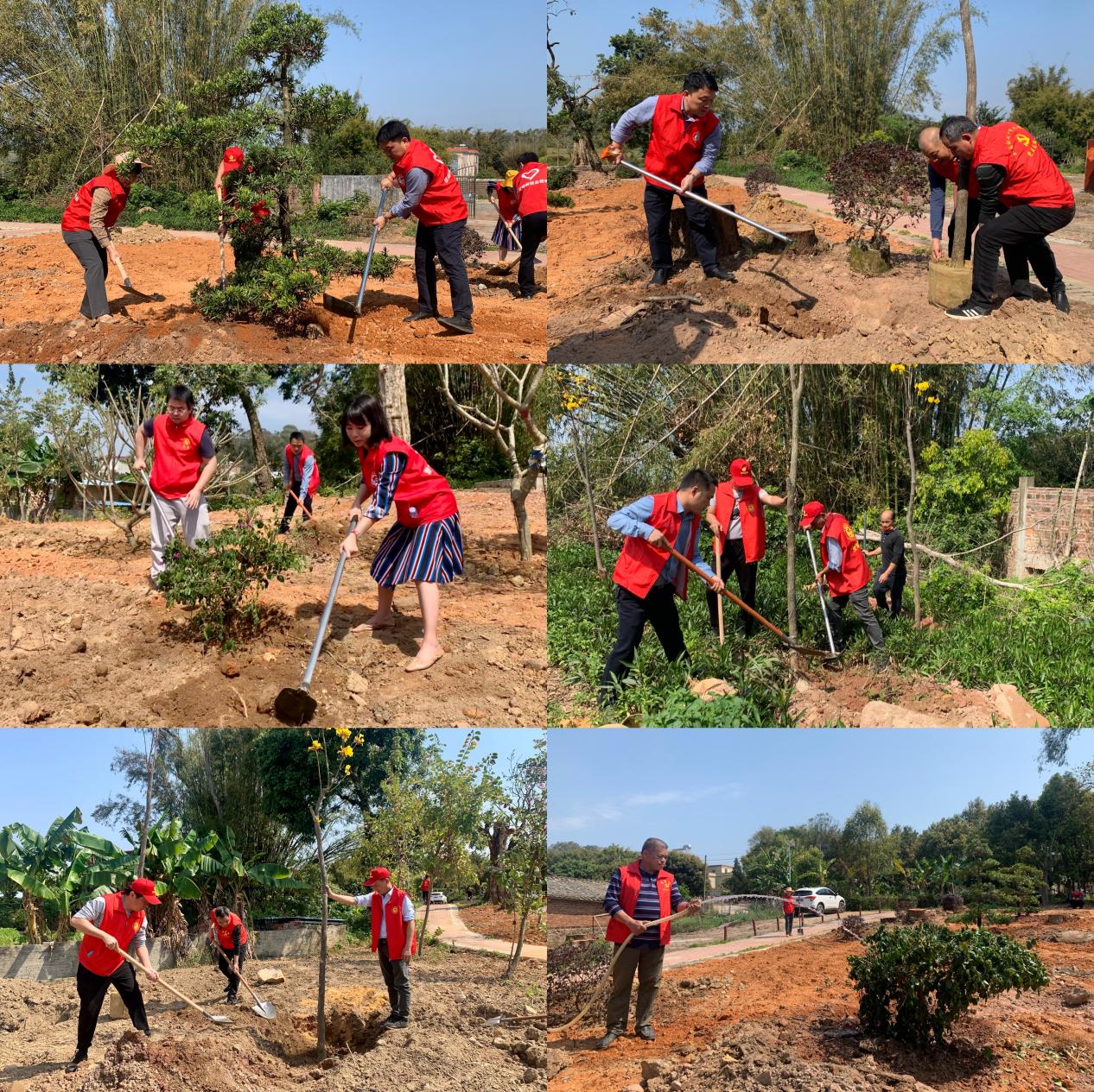 植树现场,大家挥锹铲土、扶植苗木、培土压实、提桶浇水合力栽下树苗,配合默契、干劲十足,为美丽家园增添了一抹绿意和活力。