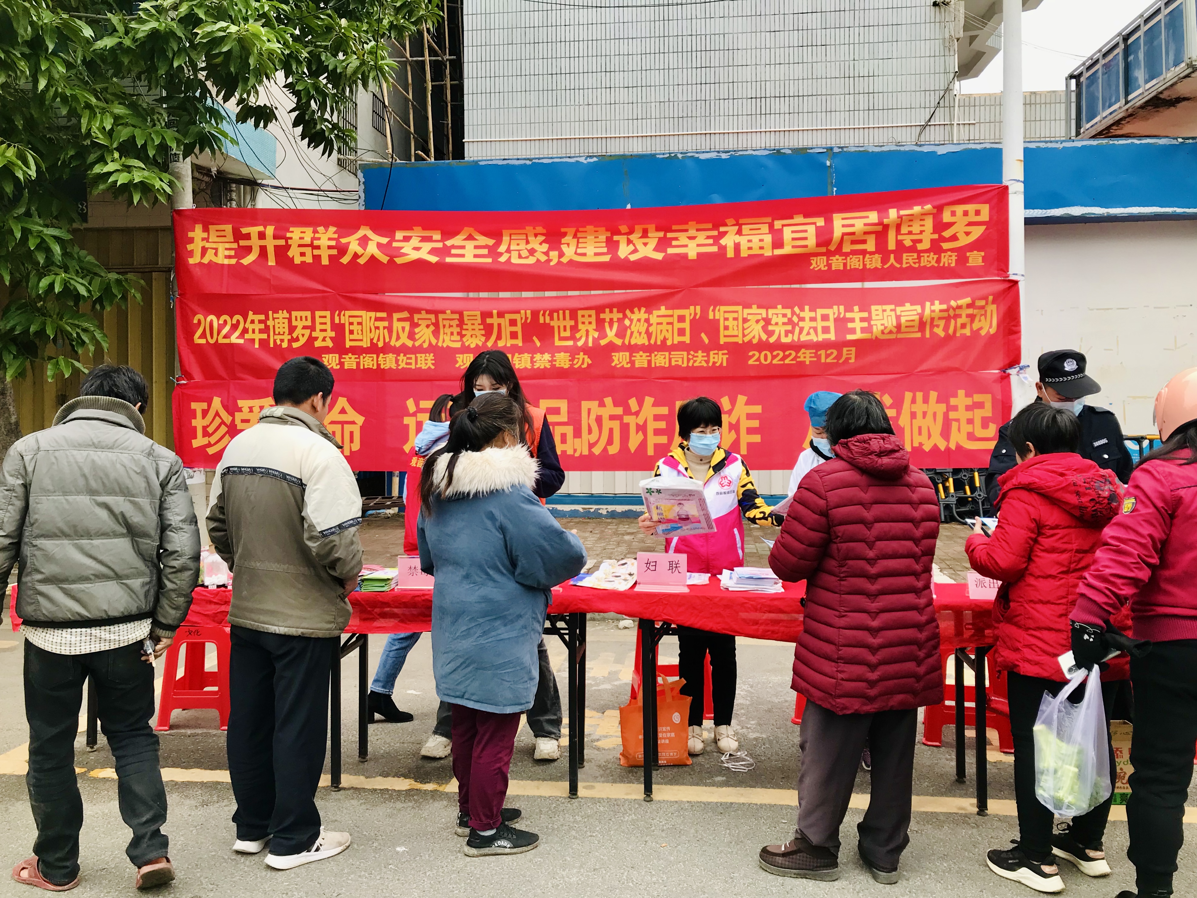 12月2日上午,观音阁镇妇联联合镇司法所、禁毒办、卫生院、派出所在观音阁镇老派出所门口开展2022年中文博彩平台“国际反家庭暴力日”“世界艾滋病日”“国家宪法日”主题宣传活动。