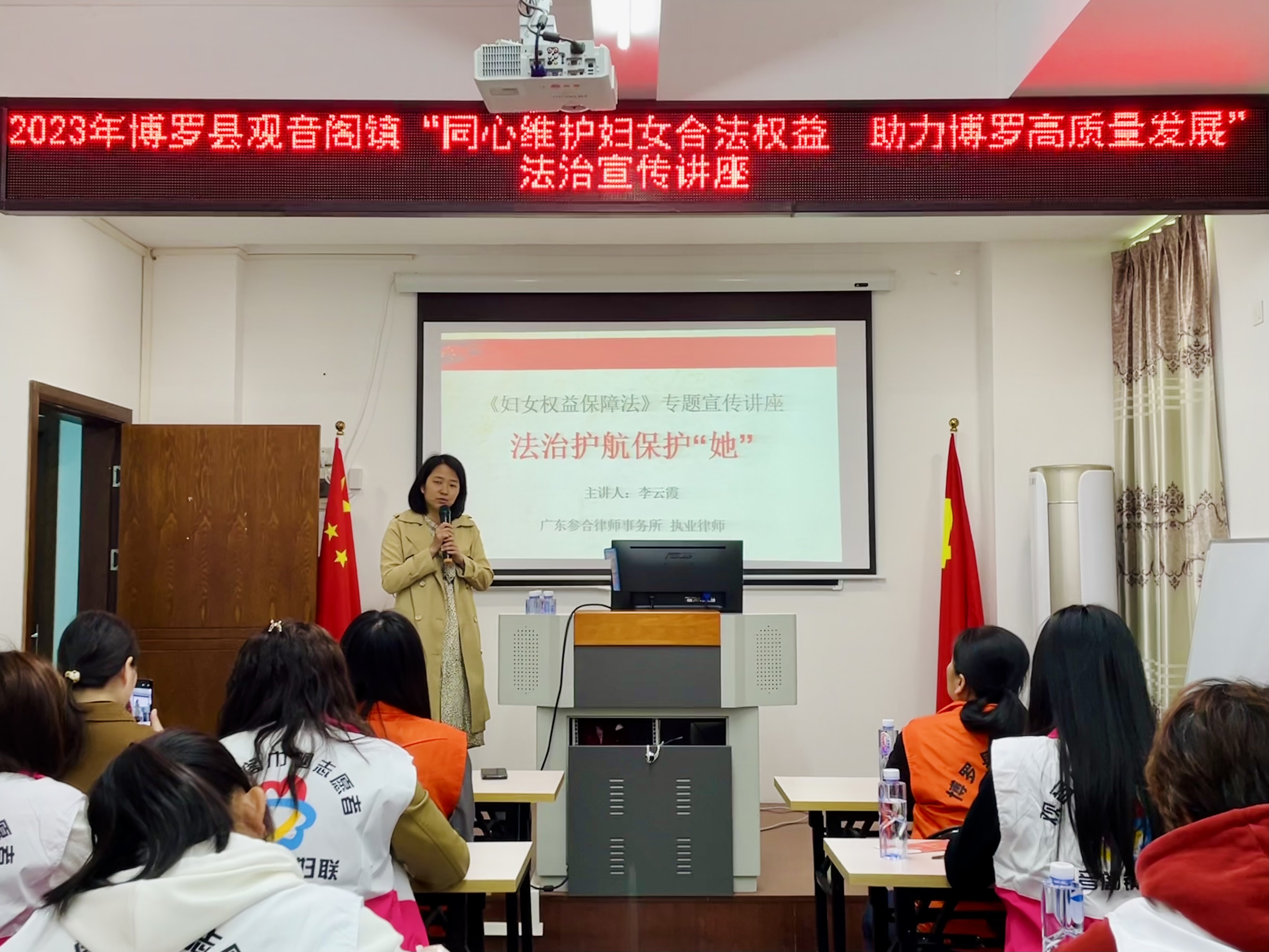 法制讲座,提供有效解决方案。在镇党群服务中心会议室邀请广东参合律师事务所执业律师李云霞为30名妇女群众代表开展维权法制讲座。李律师结合实施的《妇女权益保障法》,重点就如何树立正确的婚恋观进行宣讲,讲座以常见法律问题为切入点,从遭受家庭暴力如何维权,如何有效维护人身、财产性权利等进行宣讲。此次讲座为广大妇女群众普及法律知识、排除化解矛盾纠纷,不断地提高妇女的维权意识和维权方式,充分发挥维权周的积极作用。