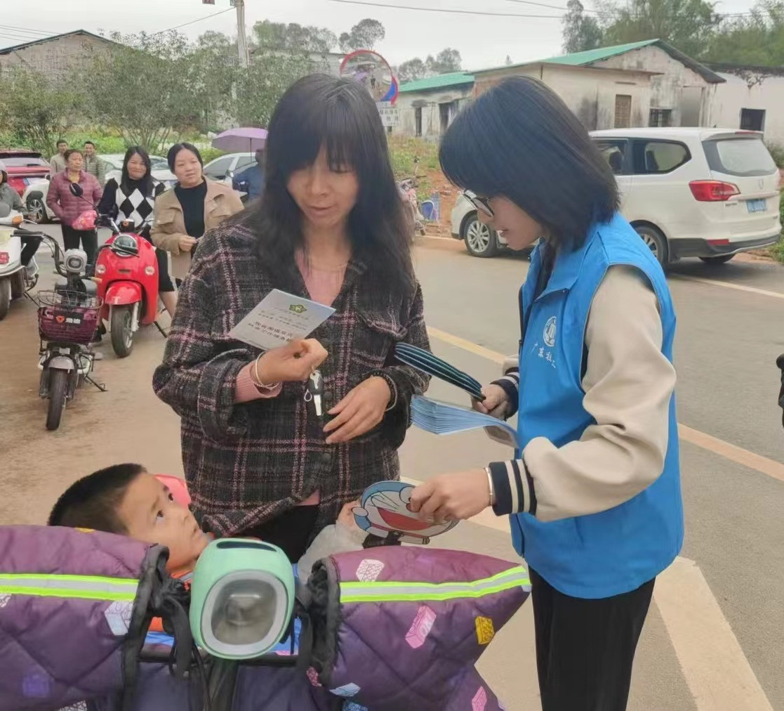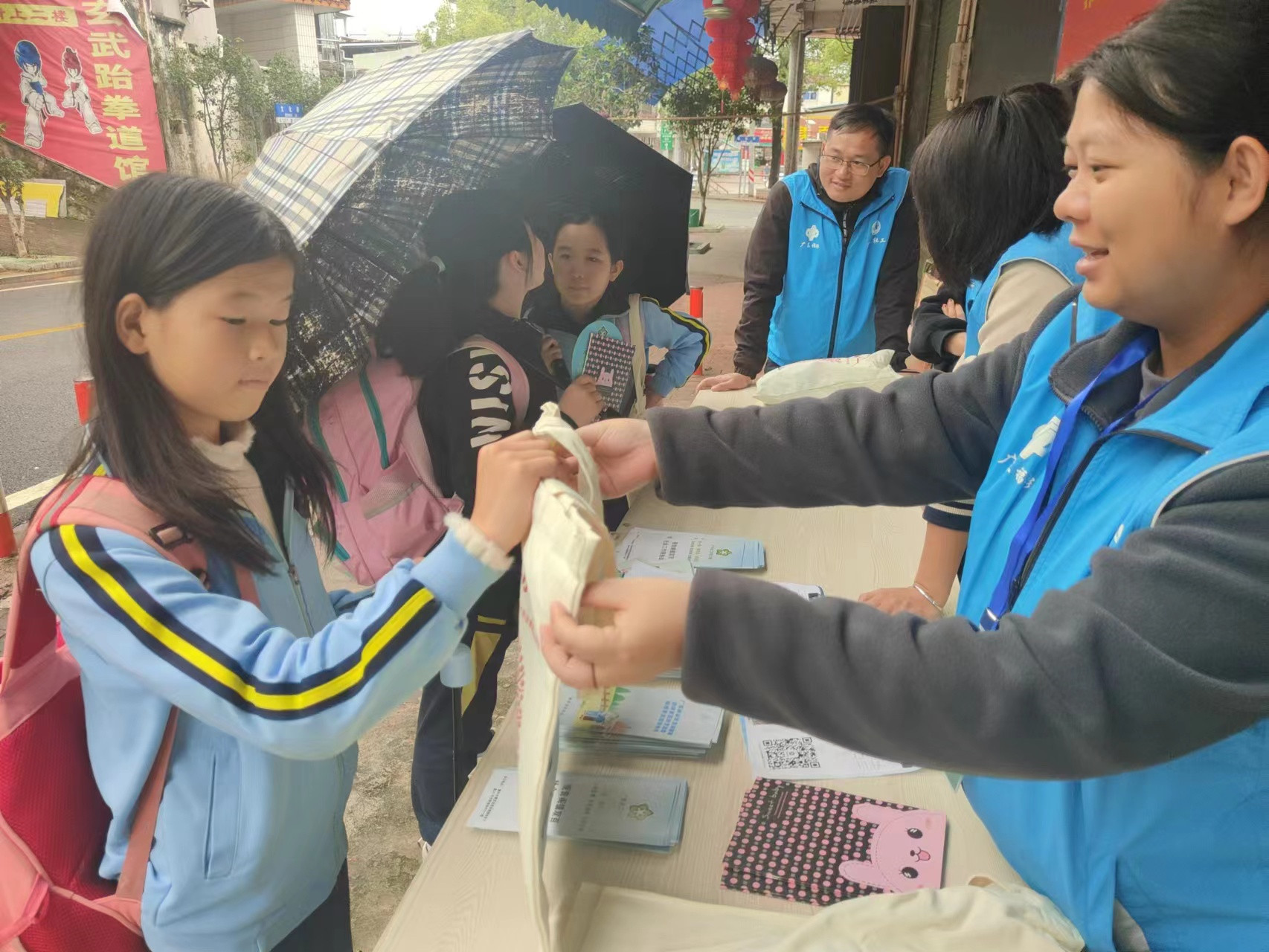 放学时间,社工们在观音阁中心小学门口发放宣传折页,为学生家长们宣讲民政救助政策,引导群众关注社工站公众号,招募以小学生为对象的小小志愿者。