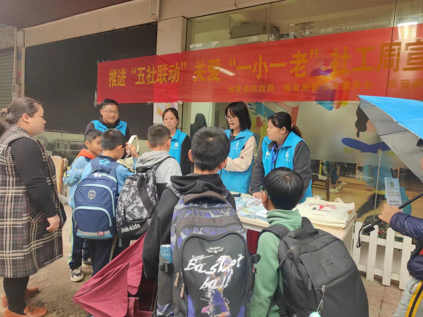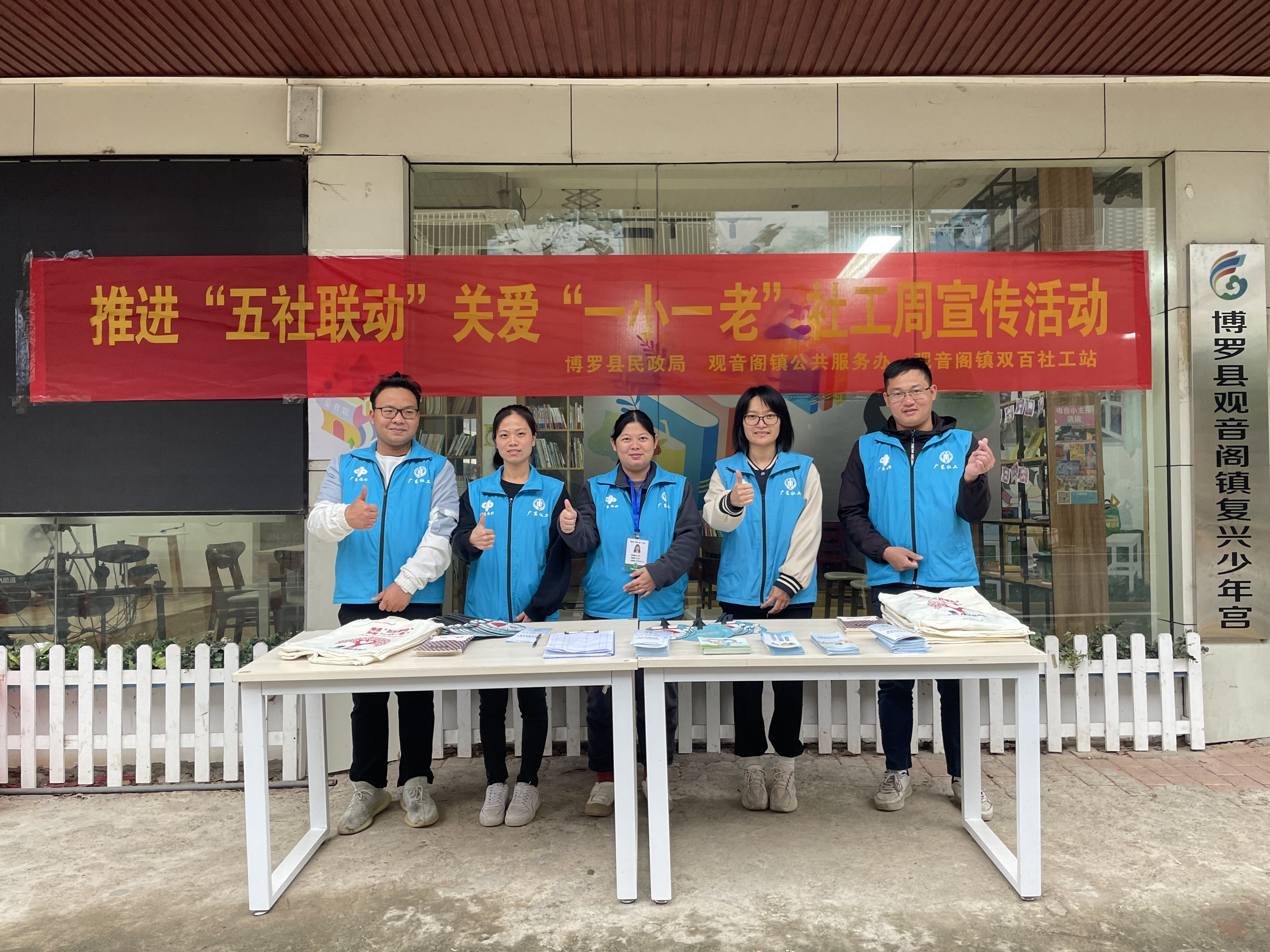 为贯彻落实习近平总书记关于社会工作的重要指示精神,宣传社会工作专业优势,展示社会工作发展成果,推动社会工作事业发展,3月30日下午,观音阁镇双百社工站在镇复兴少年宫开展“推进五社联动,关爱一小一老”的社工周宣传活动。