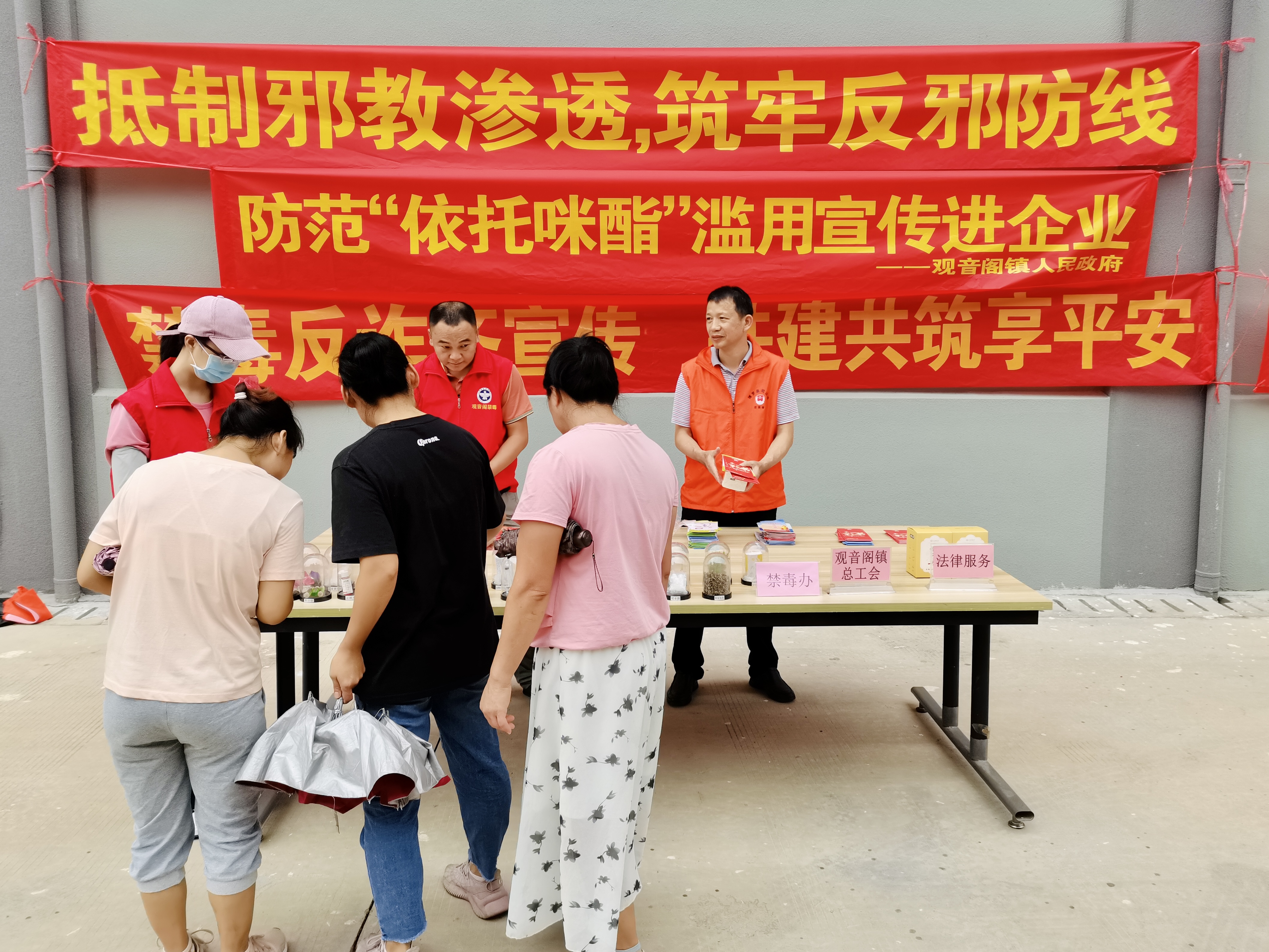 为加强我镇企业员工禁毒能力和参与禁毒工作的积极性,8月10日,观音阁镇禁毒办联合工会、司法所、综治办等部门到顺南食品厂开展新型毒品替代品“依托咪酯”禁毒宣传及反诈等宣传活动。