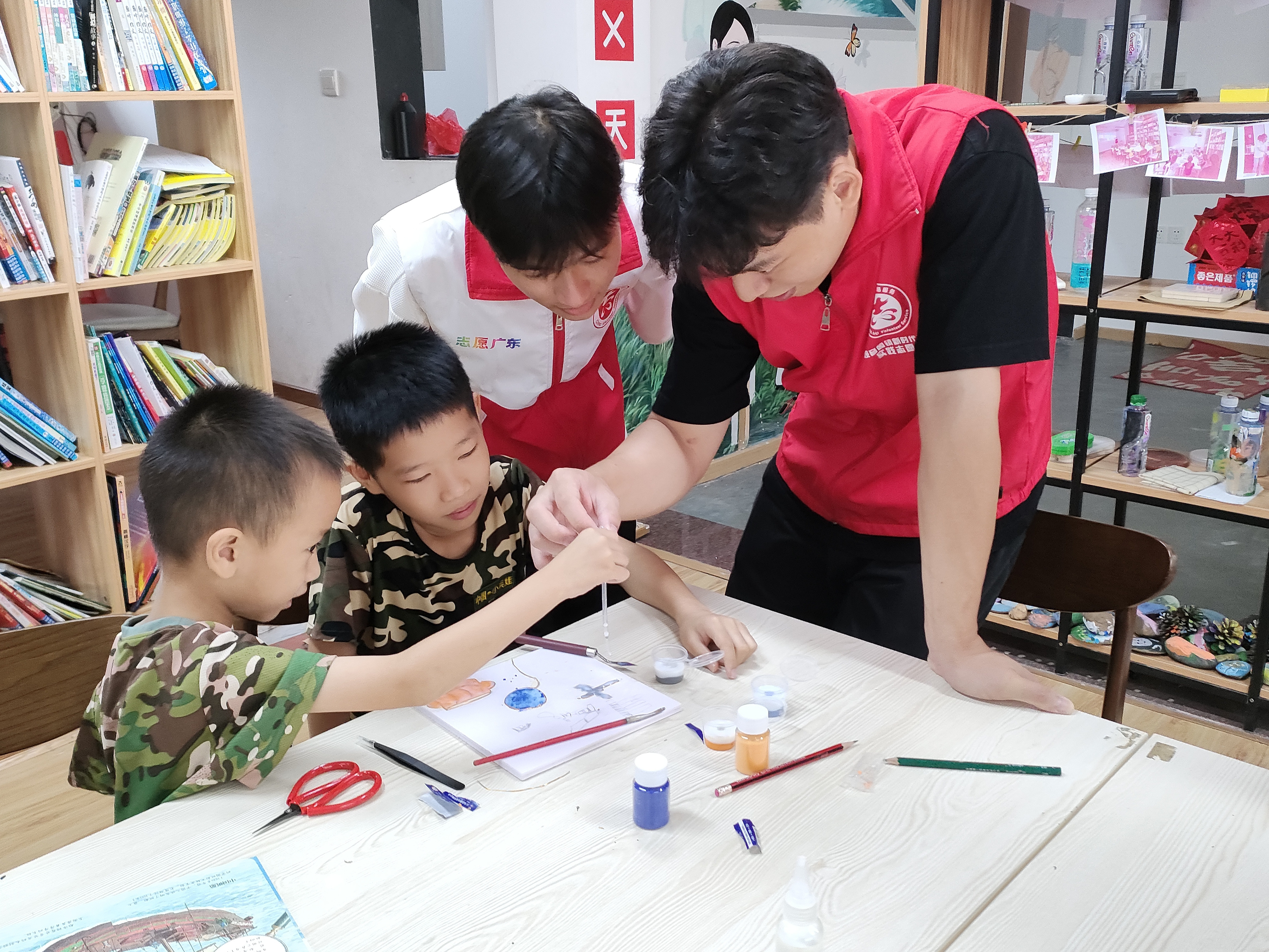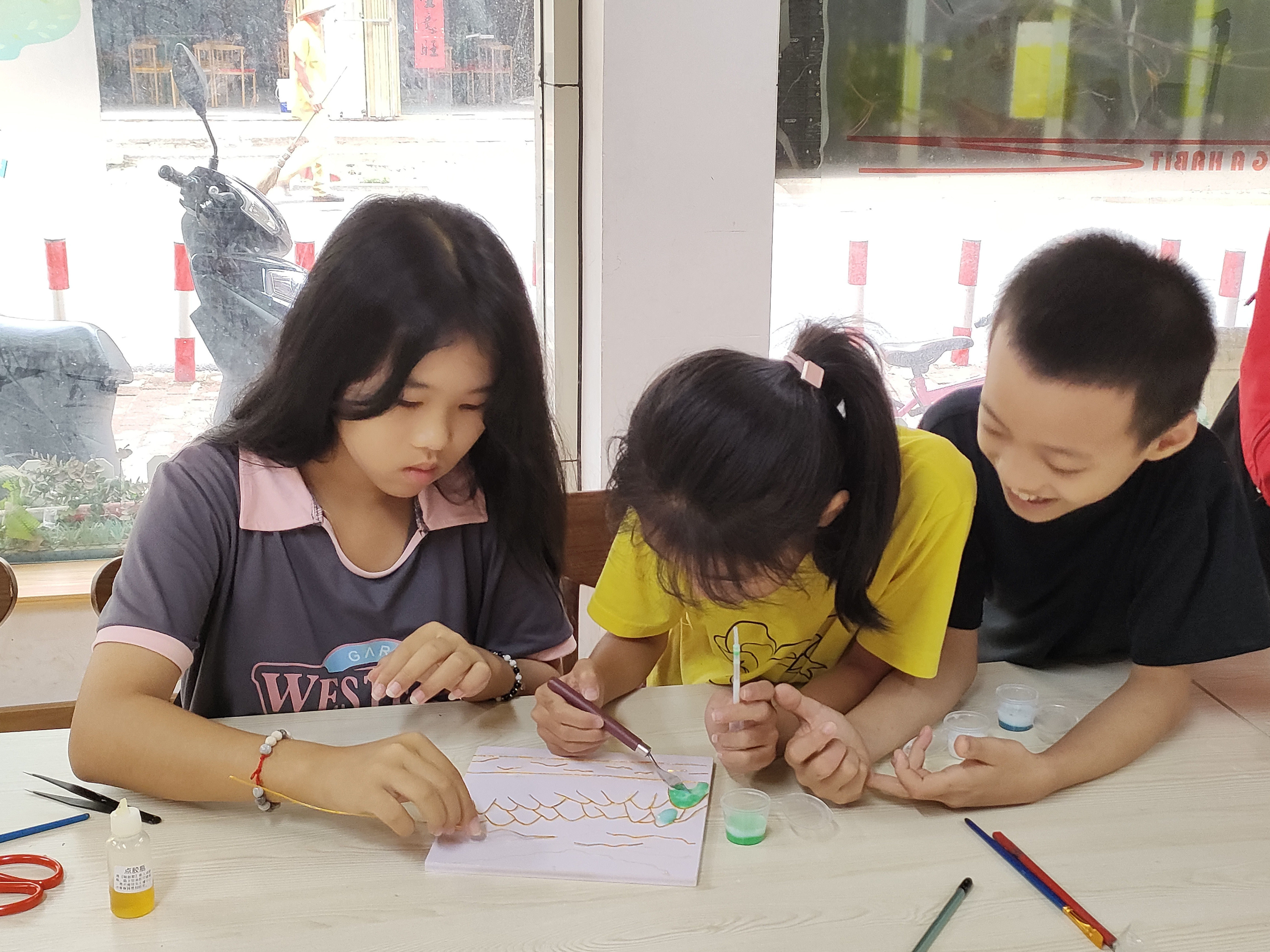 活动伊始,大学生志愿者彭晓思向孩子们详细介绍了景泰蓝的历史,并讲解了工艺流程,神奇精美的艺术令孩子们赞叹不已,孩子们尝试掐丝、点蓝,近距离感受传统工艺的艺术魅力;孩子们专心致志地创作着,从柔软的扁铜丝到七彩斑斓的掐丝珐琅画。