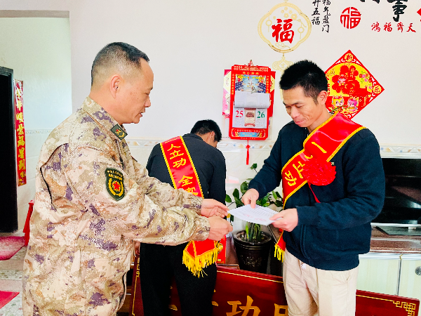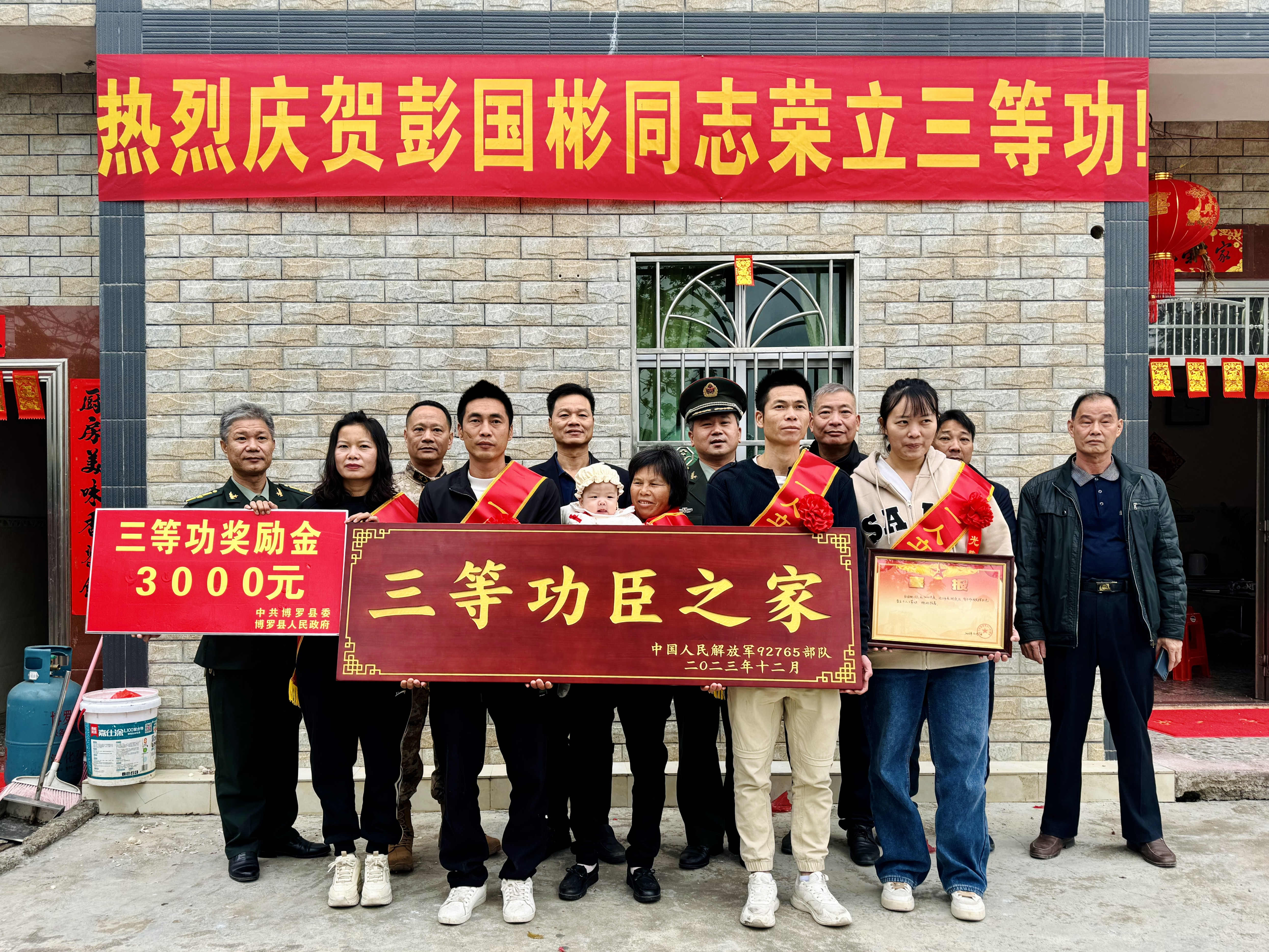在彭国彬家里,一行人为彭国彬及其家属们佩戴绶带,送上立功喜报、“三等功臣之家”牌匾和奖励金,并与其家属亲切交谈,详细了解家庭生产生活情况,对其为部队、为国家、为家乡培养出优秀人才表示感谢。希望家属一如既往地支持彭国彬的工作,鼓励彭国彬继续发扬部队的优良传统,争取再创佳绩。彭国彬家属表示,“获得如此荣誉离不开党和国家关心关怀,离不开部队的精心培养,今后将坚决当好后盾,希望儿子继续努力,为国防事业贡献力量,为家乡增光添彩。”