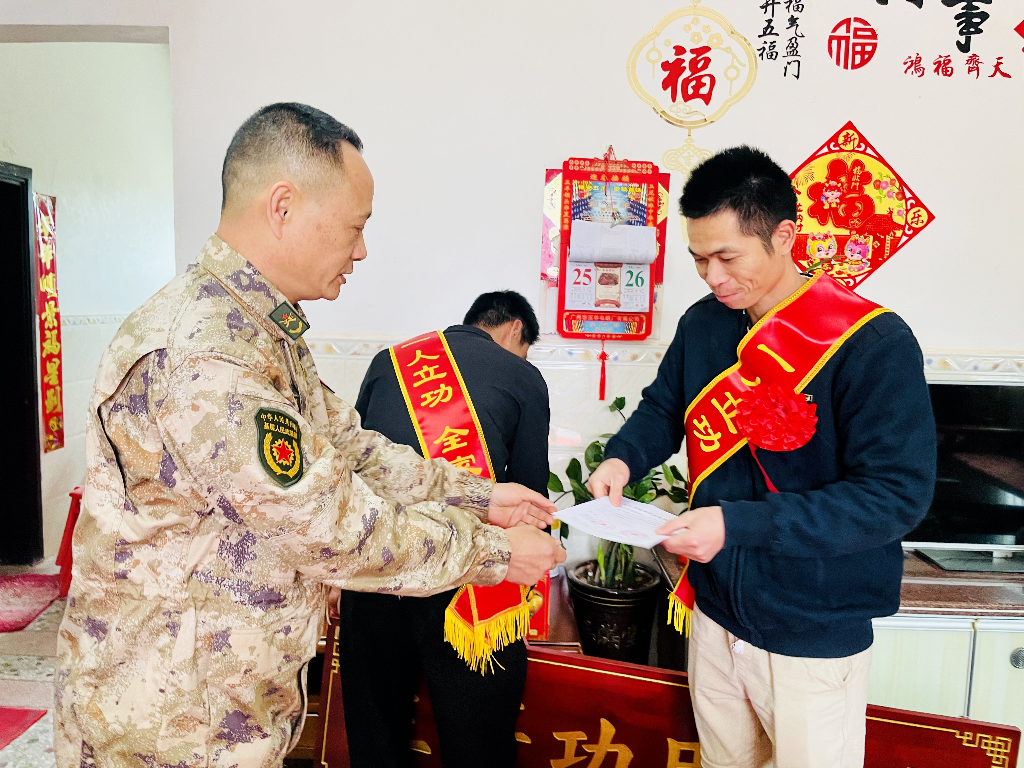 建功在军营,喜报传家乡!2024年2月27日上午,中文博彩平台人武部、县退役军人事务局主要领导及观音阁镇党委委员、武装部部长刘振光,为我镇在部队荣立“三等功”的现役军人彭国彬开展登门送喜报活动,并送上党和政府的关怀和慰问。