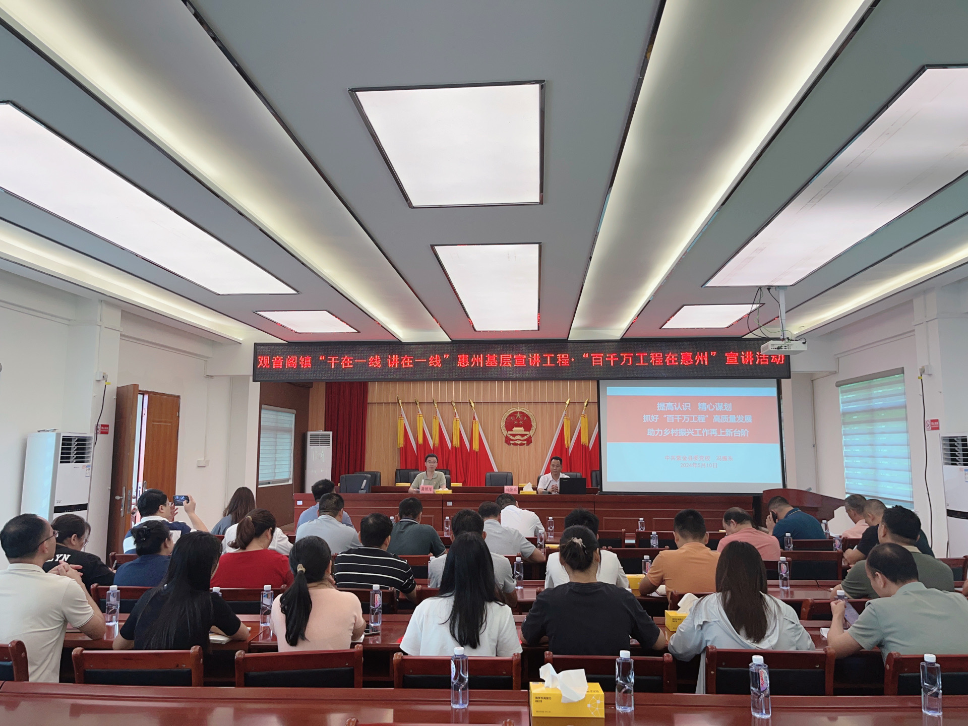 为深入学习贯彻习近平新时代中国特色社会主义思想,落实党纪学习教育工作部署,充分调动广大党员干部积极性,主动投身到助推百千万工程建设,5月10日,观音阁镇党建工作办公室联合乡村振兴驻镇帮镇扶村工作队开展 干在一线 讲在一线”“百千万工程在惠州”宣讲暨“思想铸党魂、学习增斗志”党员进党校培训。此次培训由镇委委员、组织委员龚照军主持,各村(社区)书记、党员代表等参加此次培训。