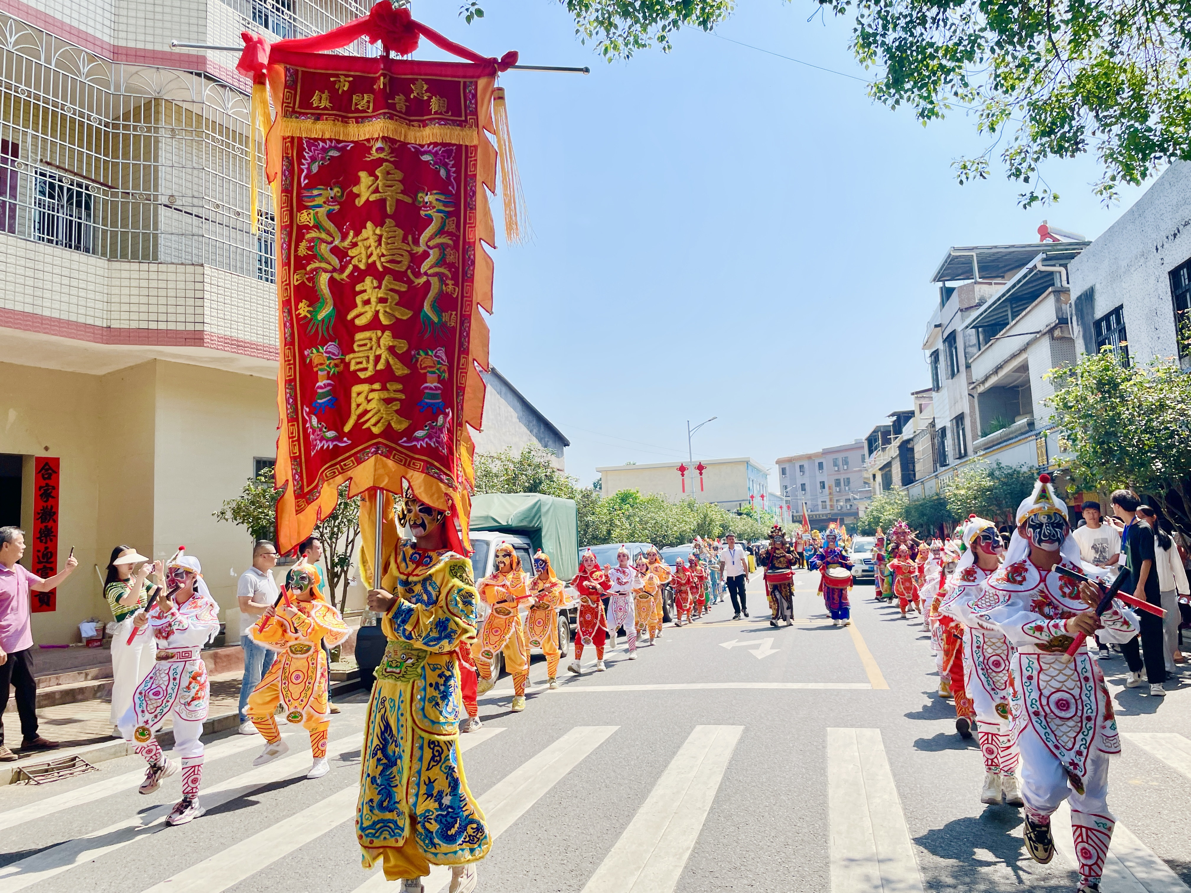 上午9点30分,8支文化巡游队伍近200人在观音阁镇口袋公园(观音庙前)集结。分别是观音阁镇社区标旗队、菱湖村醒狮队、十字路麒麟队、观音阁镇埠鹅英歌队、观音阁镇腰鼓队,还有应邀而来的普宁富美青年英歌队、佛山轩金龙狮团和萧氏酷狮团集体亮相。他们以“展演+巡游”的方式,向当地群众和八方游客展示古镇文化、小镇魅力。