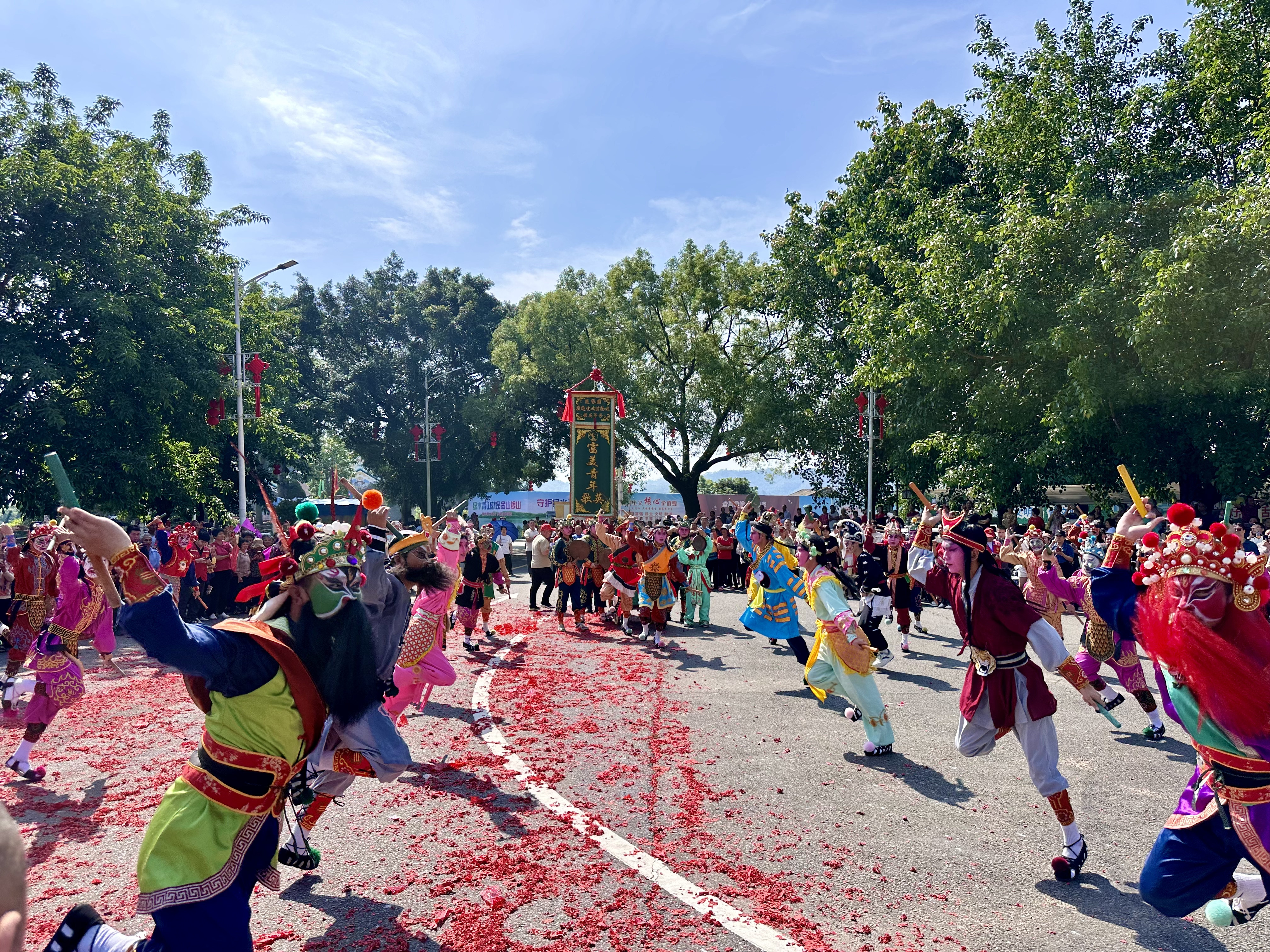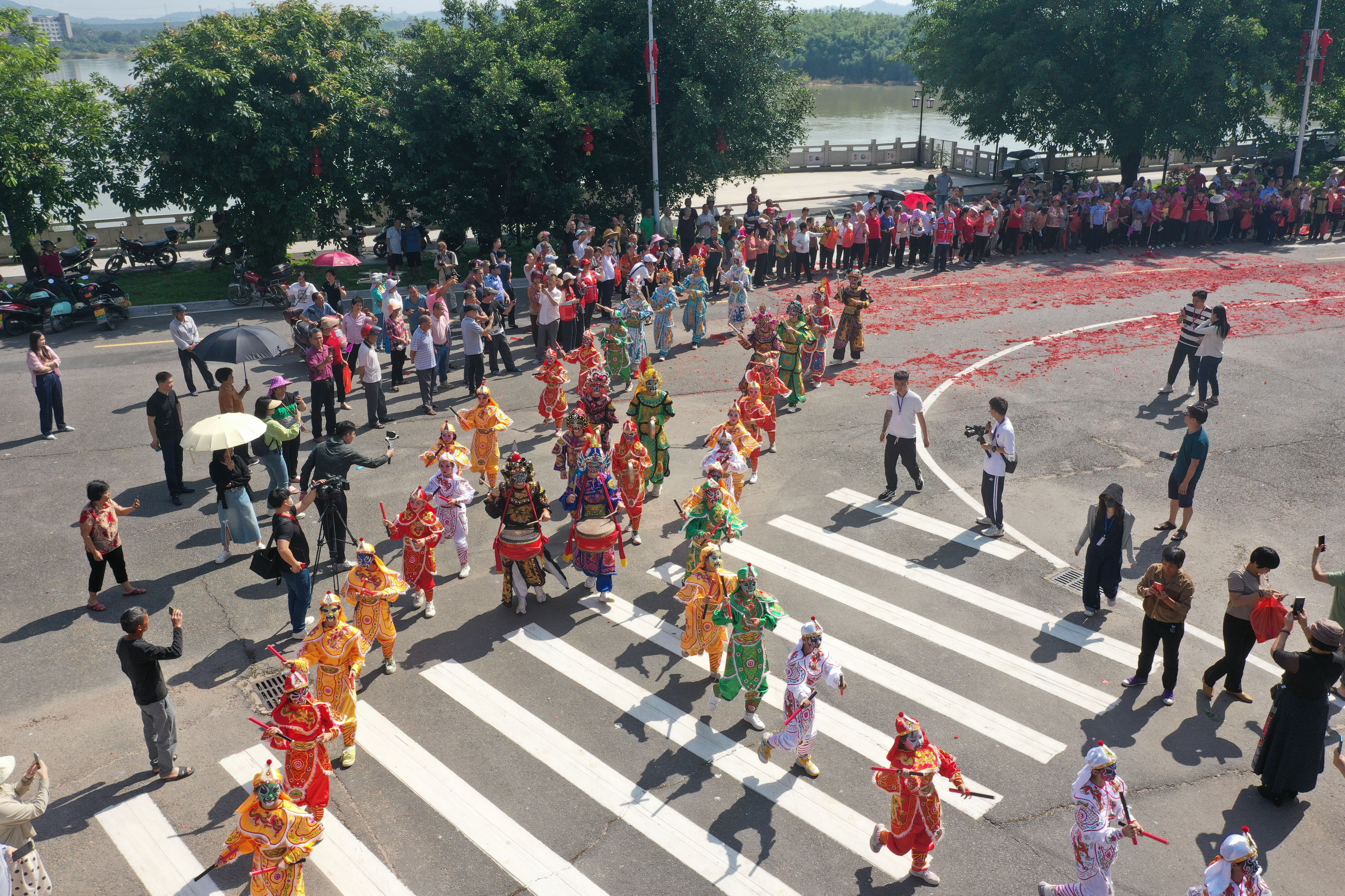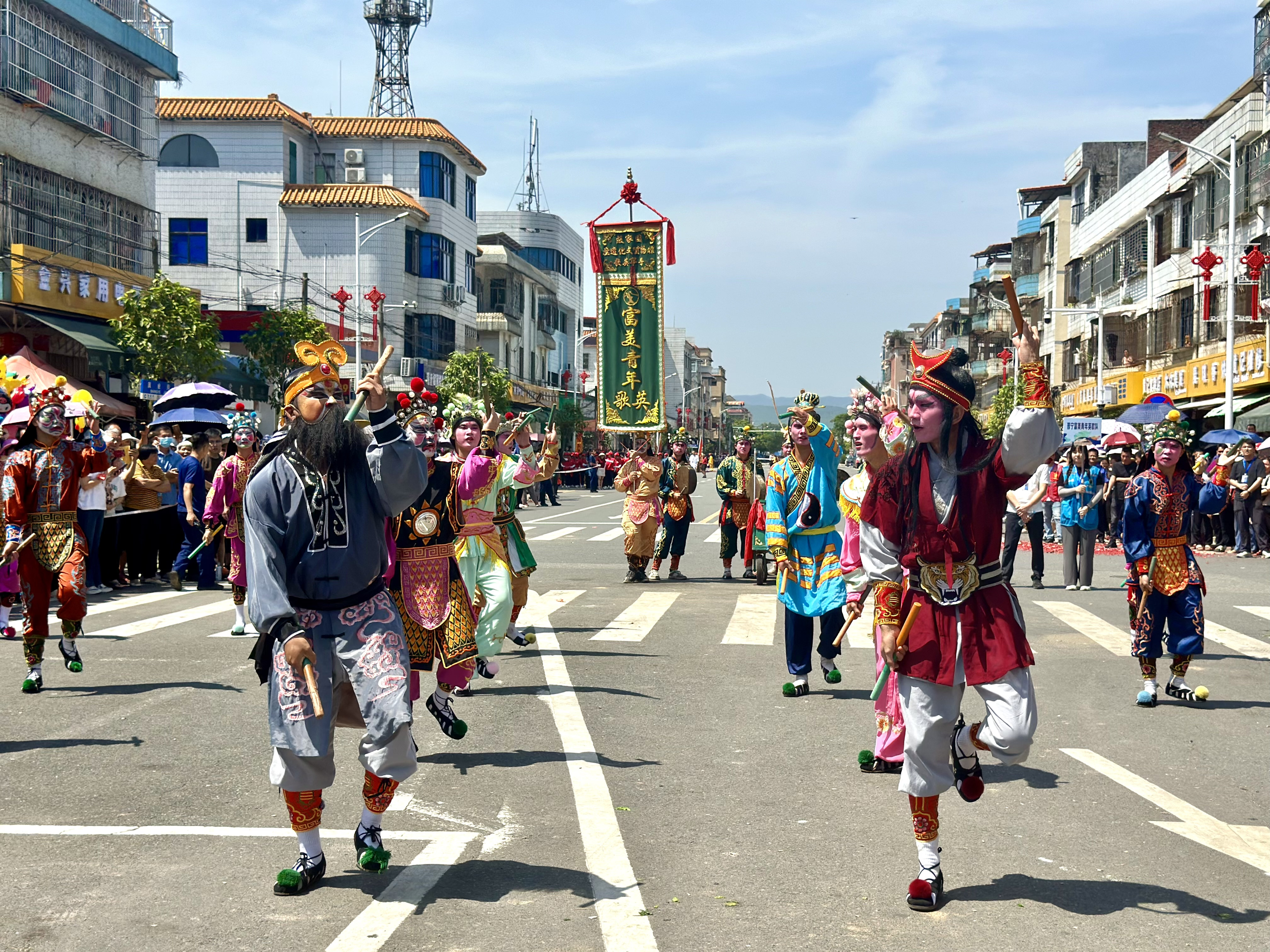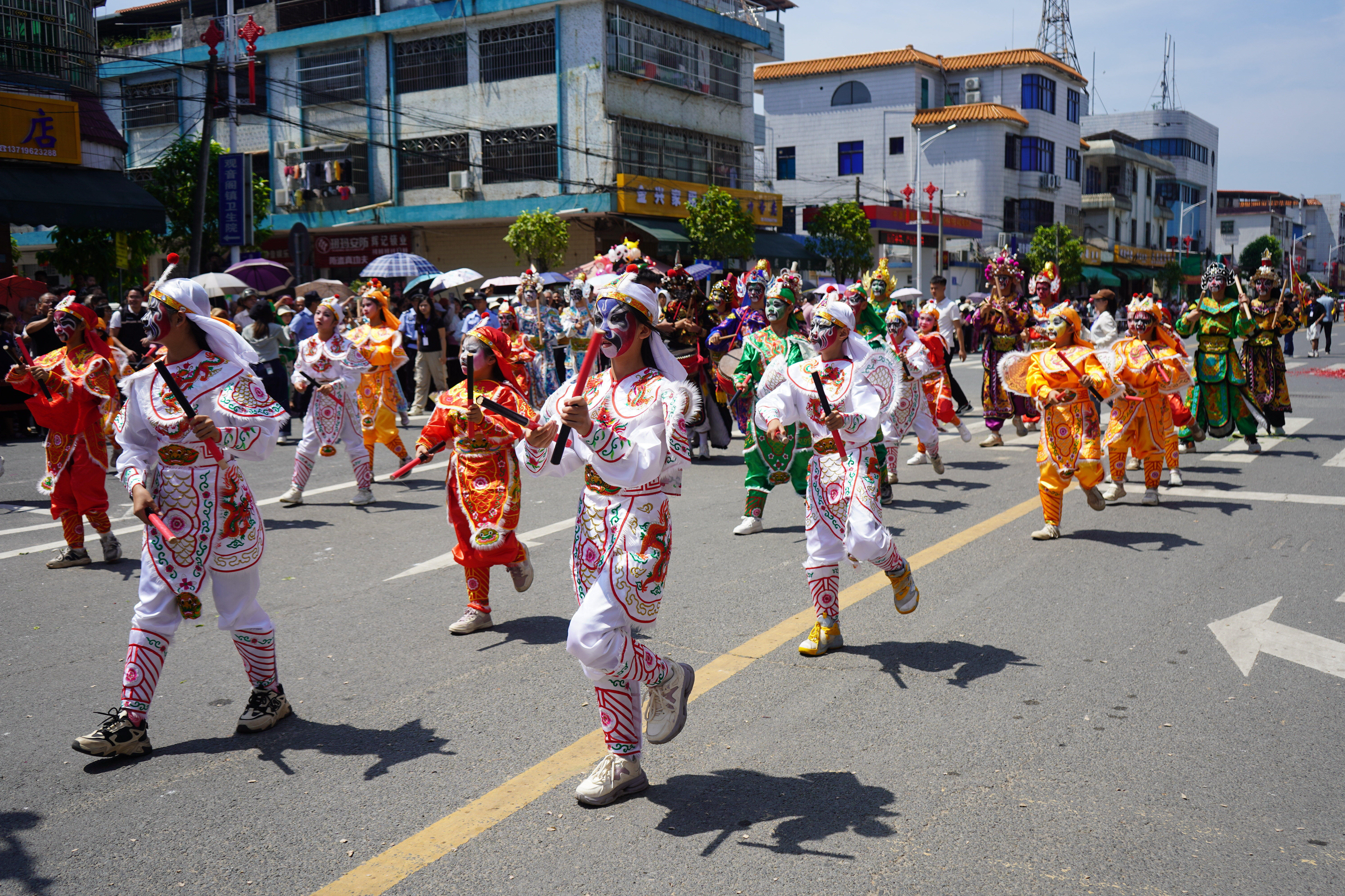 东江古镇,祈福观音阁。5月15日,2024年观音阁镇非遗民俗文化巡游活动举行,独具特色、多姿多彩的民俗文化表演吸引了众多群众前来观看,享受非遗文化盛宴。