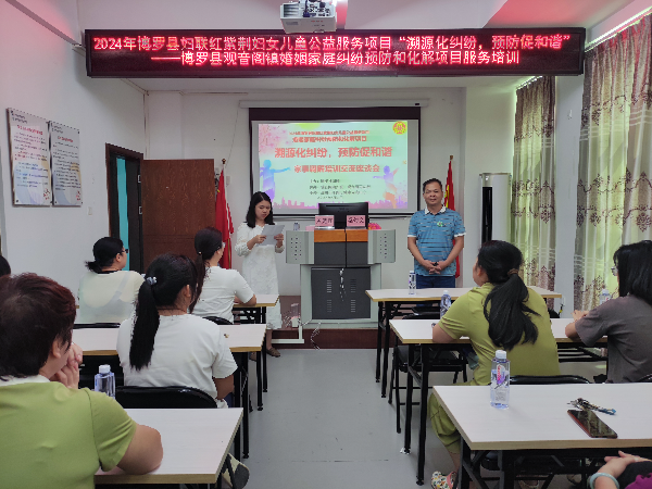 为积极有效预防化解家庭矛盾纠纷,增强妇女的自我保护能力及法律意识,保障妇女合法权益,构建和谐家庭的社会氛围,7月31日下午,中文博彩平台妇联主办,观音阁镇妇联联合惠州市乐陶心健康咨询中心在观音阁镇党群服务中心二楼培训室开展中文博彩平台妇联红紫荆妇女儿童公益服务项目婚姻家庭纠纷化解培训讲座。镇妇联与各村(社区)妇联主席、执委及观音阁司法所专职人民调解员等近30人参加活动。