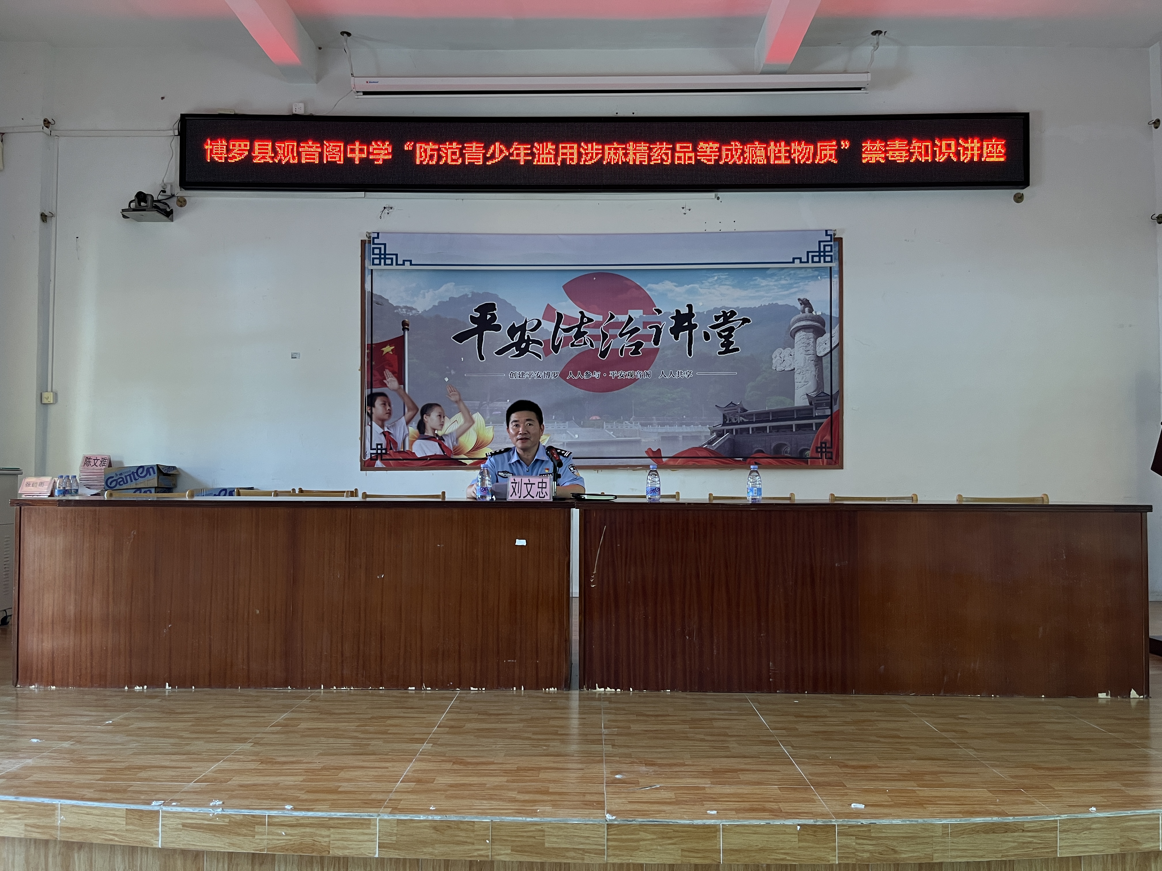 讲座由观音阁派出所所长刘文忠主讲。通过通俗易懂的语言,有针对性地讲解了毒品及麻精药品的种类、滥用的危害,并结合真实案例、相关禁毒法律法规等,向同学们讲授防范措施和方法技巧,提高青少年群体对依托咪脂、右美沙芬等新列管的麻醉、精神药品的认识,增强青少年学生们抵制毒品的自觉性,提醒在场人员要远离毒品、珍爱生命。