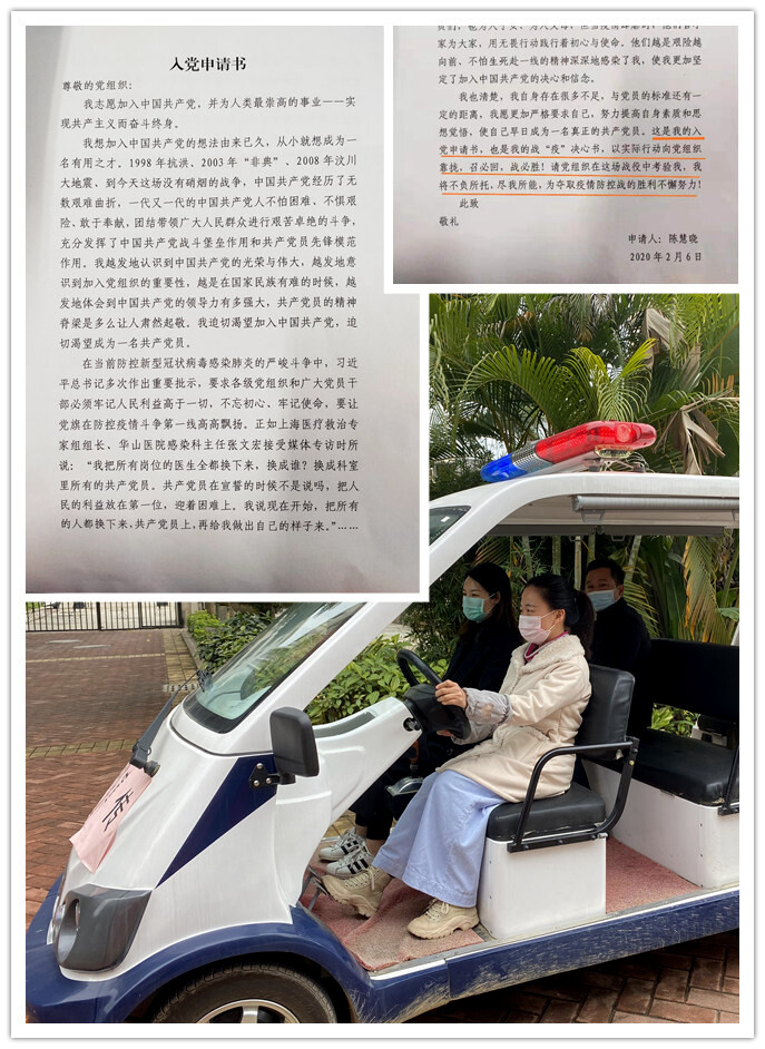 “这是我的入党志愿书,也是我的战‘疫’决心书”,我将以实际行动向党组织靠拢,召必回,战必胜!请党组织在这场战役中考验我,我将不负所托,尽我所能,为夺取疫情防控的胜利不懈努力!”这是一份在防疫期间镇第三党支部书记收到的特殊的《入党申请书》。这是公庄团镇委副书记陈慧晓向党作出的庄严承诺,在这个特殊时期,她坚守岗位,用一颗热血衷心表达了一个团员青年加入中国共产党的坚定决心。