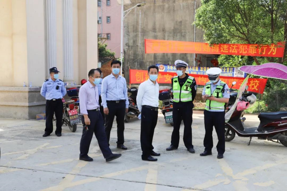 公庄镇委副书记刘锦辉、镇文教助理李志明亲临现场,检查指导学生返校工作。他们再次对学校门口的体温测量通道及登记情况,防控物资储备及存放、食品卫生安全、饮用水质及学生饮水系统,课室、宿舍、校园及周边环境卫生保洁和消杀等情况进行了逐一实地查看。公安交警派员前来疏导来往车辆,维持秩序;卫生院派出防疫副校长在校门口指导防疫工作。学生按照学校制定的方案有序返校,复课工作稳妥推进。