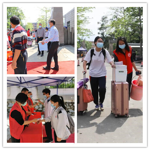七点多,林伟聪校长带领教师团队在校门口迎接,做好体温检测,落实“一个精准”、“三个一律”、“三个提醒”,同时接收学生的《体温检测表》、《行程轨迹表》、《健康卡》、粤康码绿码,帮助返校学生运送大件行李等,其他班子成员按照分区管理的原则,分别在宿舍、课室、饭堂等岗位配合做好迎接工作。