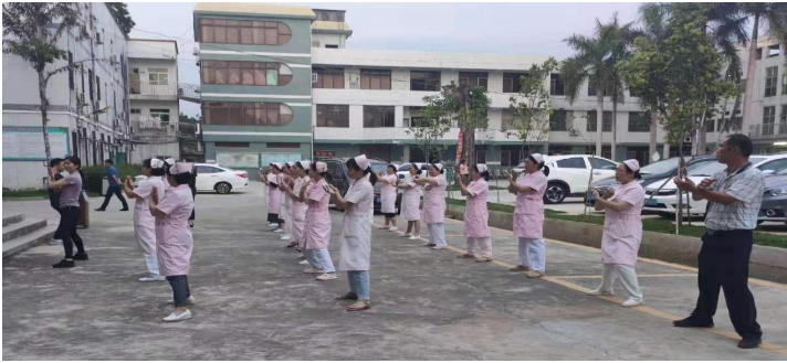 会后,全体护士进行八段锦练习,为增强职工身体素质营造良好的氛围,树立榜样。