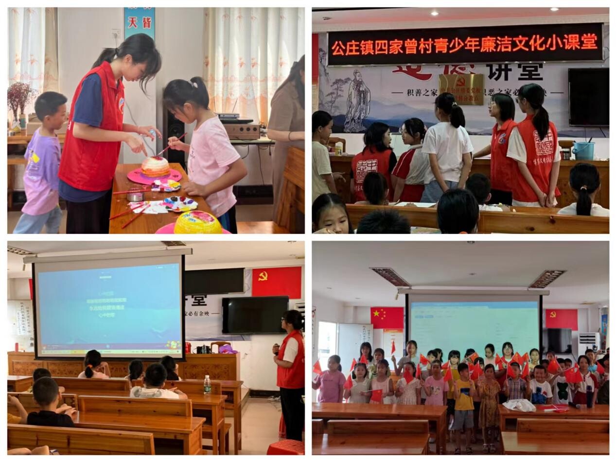 助力公益课堂。近期,公庄镇四家曾村开展乡村“复兴少年宫”系列活动之暑期“红色课堂”公益班,大学生到现场帮忙,协助老师教小朋友们绘画草帽、练习书法、学唱红歌等等,培养孩子们的兴趣,给乡村的孩子打开了一扇梦想的大门。