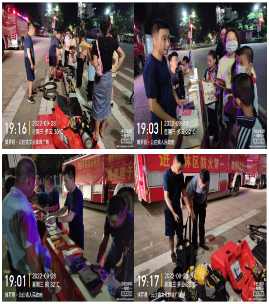 9月28日,镇委委员、常务副镇长陈胜旺带领公庄镇专职消防队在镇文化广场开展宣讲活动,现场发放宣传资料包括消防安全宣传图册、《火灾案例教育警示》、《致广大居民朋友们的一封信》等,向群众详细讲解灭火方法、火灾逃生自救技巧等知识,同时利用消防宣传车悬挂宣传横幅、展示消防器材、车辆等多种形式,向群众广泛普及消防安全及防火用火知识,以不同的展现形式,使群众了解更多的消防安全知识。