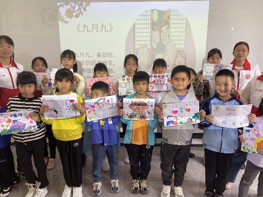 描绘重阳节,感恩常相伴。志愿者老师引导孩子们通过想象,感恩亲人,亲手描绘重阳节,让孩子们懂得“百善孝为先”的传统美德,并让孩子们将自己亲手描绘的作品,拿回家赠送给爷爷奶奶,同时可以通过敲背、捶腿、做饭、唱首歌等形式,表达对爷爷奶奶的爱。