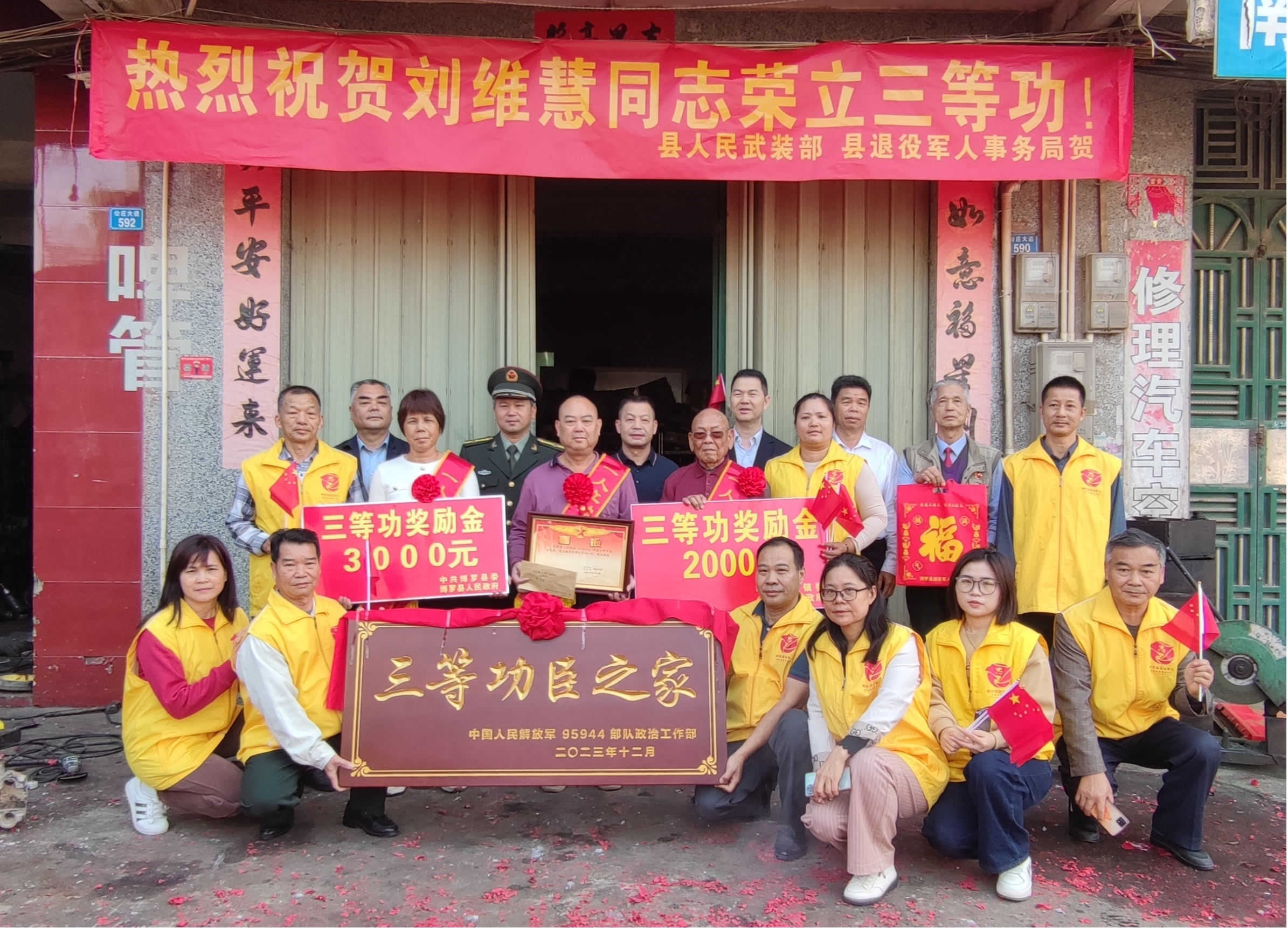 当天上午,在一派锣鼓喧天、交首称赞声中,县退役军人事务局副局长夏泉进、县人民武装部干事张光华等为刘维慧的家人披绶带、戴红花、送上喜报和奖励金。镇党委委员、武装部部长黄永南代表公庄镇党委、镇政府给家属送上“三等功臣之家”牌匾及奖励金,并表示热烈的祝贺和崇高的敬意。据了解,刘维慧于2012年12月应征入伍,在部队服役11年,吃苦耐劳、奋力拼搏,在2023年度工作中荣获教育管理“三等功”荣誉称号。