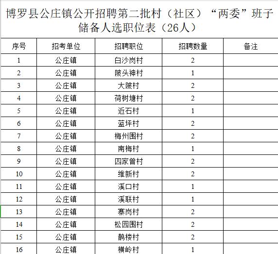 结合村(社区)“两委”班子建设专题调研成果,公庄镇公开招聘26名村(社区)“两委”班子储备人选,具体职位见《中文博彩平台公庄镇公开招聘第二批村(社区)“两委”班子储备人选职位表》(附件1)。
