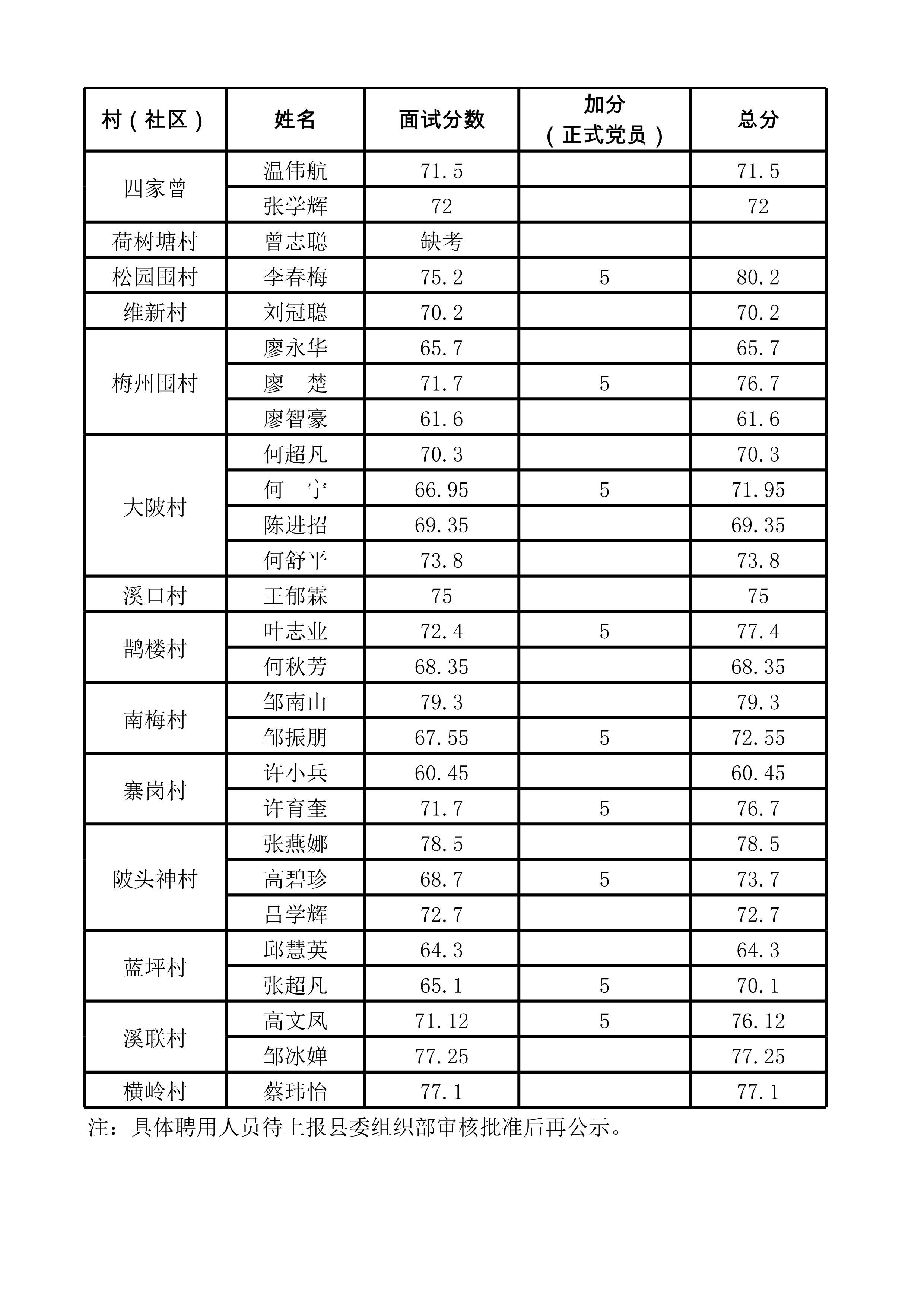 根据《中文博彩平台公庄镇公开招聘第二批村(社区)“两委”班子储备人选公告》规定,第二批村(社区)“两委”班子储备人选公开报名、资格审查、面试等招聘工作已经结束。结合面试总体情况,经研究,面试成绩合格分数线划定为60分,现将报考各职位考生面试成绩予以公示。