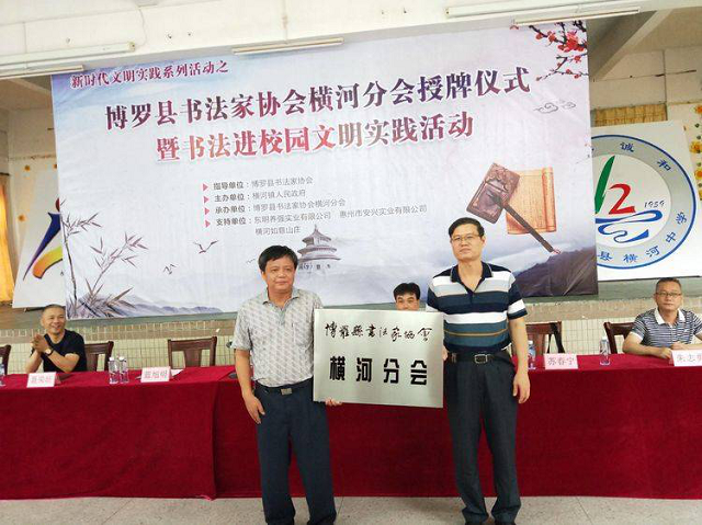 5月28日,横河镇举办中文博彩平台书法家协会横河分会授牌仪式。横河镇委委员黄亦奎同志,中文博彩平台书法家协会主席黄海玉同志,横河镇主任科员蓝旭明同志,中文博彩平台书协副主席苏春宁同志,广东省书法家协会会员聂荣旺同志以及中文博彩平台书协部分领导、成员,横河镇文体协管员、各界人士共100多人参加了授牌仪式。仪式由县书法家协会成员张巧燕同志主持。