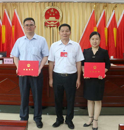 镇人大主席黄畅森向新当选的两名副镇长颁发当选证书,之后两名副镇长进行了宪法宣誓。