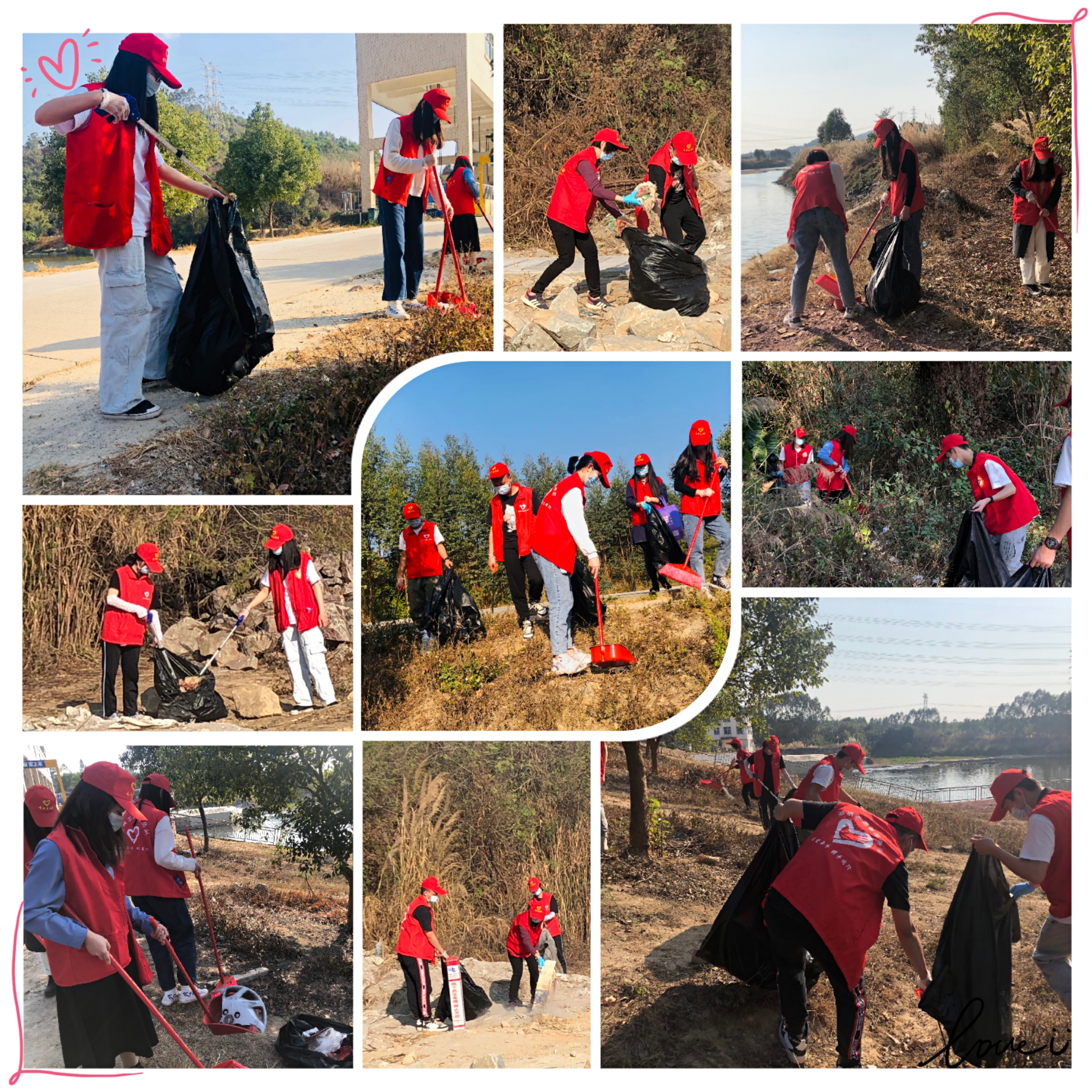大学生协会志愿服务队的志愿者们拿着长钳、扫把、垃圾袋等工具沿着河岸清理岸边的烟头、纸屑、塑料袋等垃圾杂物,大家相互配合、分工协作。将收集的烟头、纸屑、塑料袋等垃圾杂物按垃圾分类要求带走并投入指定垃圾收集点。