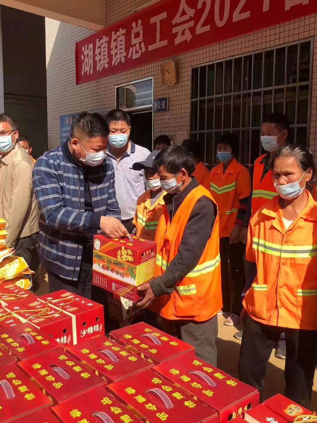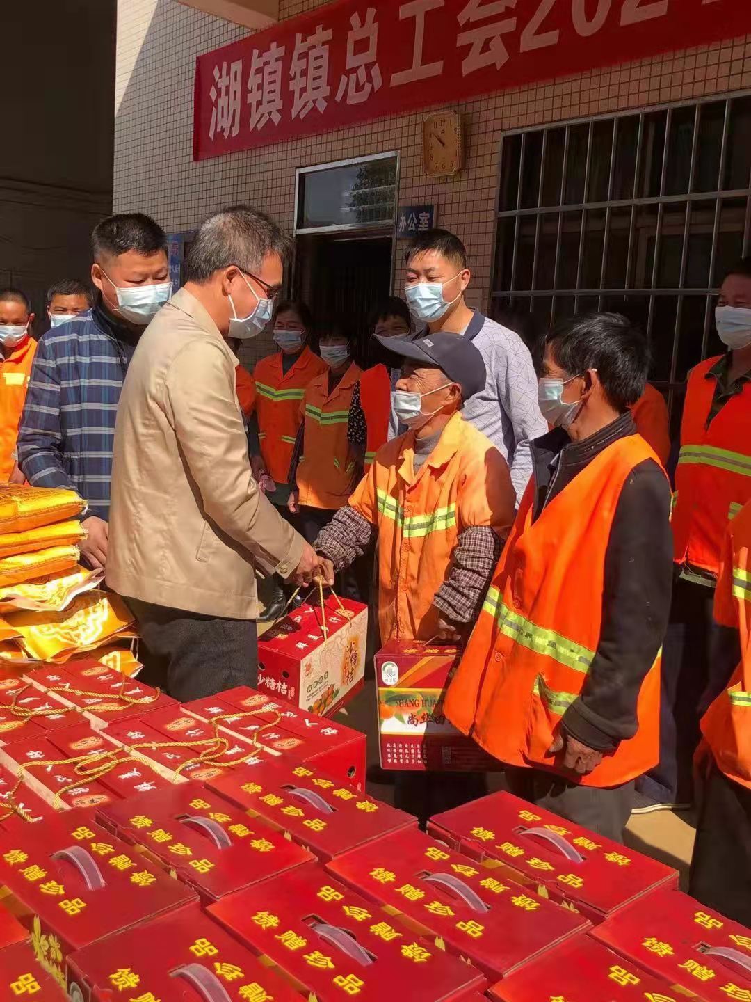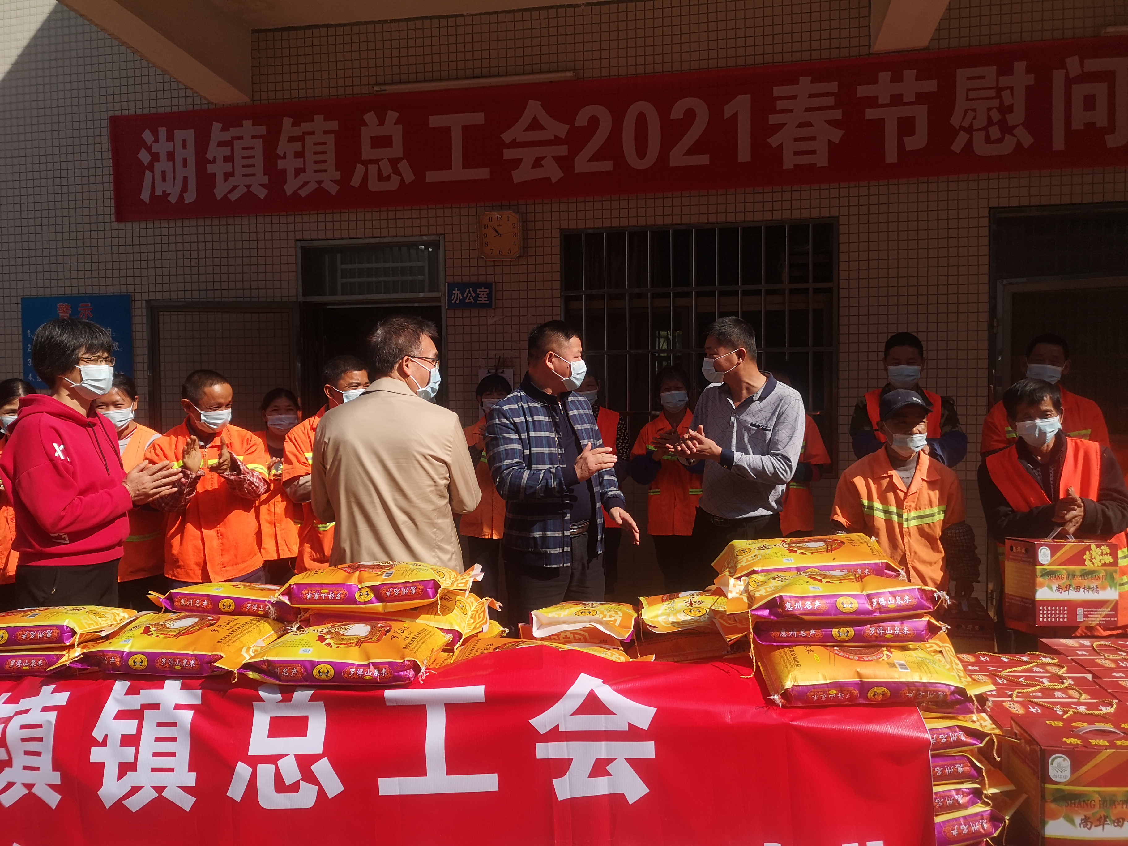 2月5日上午,县总工会常务副主席张敏才、镇委副书记邹锦杨、镇总工会专职副主席胡金兰带领我镇工会工作人员来到湖镇镇环卫站(转运站)亲切看望慰问一线环卫工人,为环卫工人们发放大米和砂糖桔等春节慰问礼品。