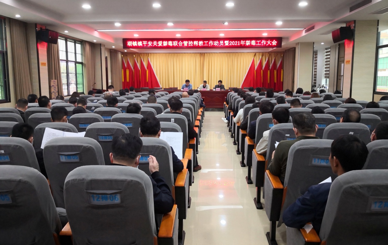 2021年3月4日上午,湖镇镇在镇政府公共服务中心二楼会议室召开湖镇镇平安关爱禁毒联合管控帮教工作动员暨2021年禁毒工作大会,镇委副书记曾学东,镇委委员高毅敏,镇禁毒办全体工作人员、各村(社区)驻村组长、各村(社区)治保主任、妇联主席以及派出所分管禁毒工作副所长、中小学校分管德育的副校长等成员单位负责人共120人参加了会议,会议由镇委委员高毅敏主持。