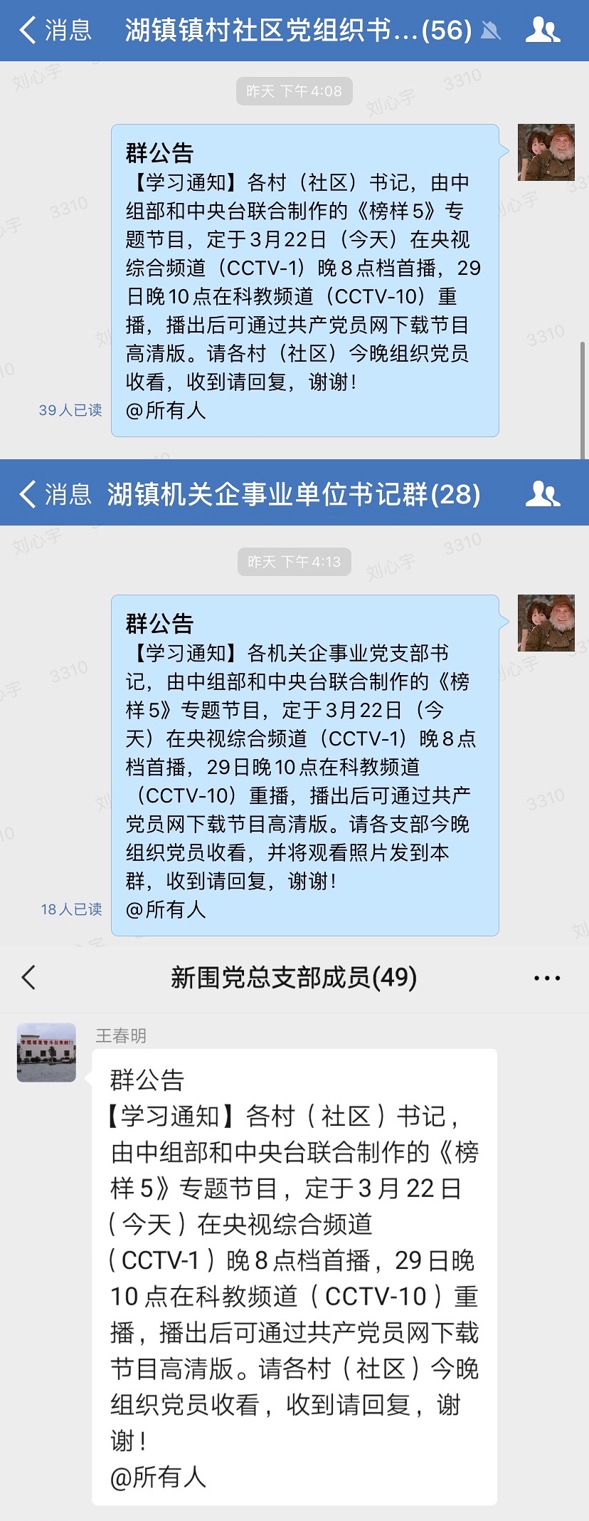学习通知发出后,各党组织立即在党员微信群上转发学习通知,号召党员干部学习收看。当天晚上,湖镇镇73个党支部的党员通过电视、网络、学习强国平台等渠道,采取多种形式组织学习收看《榜样5》,有在村党群服务中心集中收看的,有在家分散观看的,观看形式灵活,效果良好。