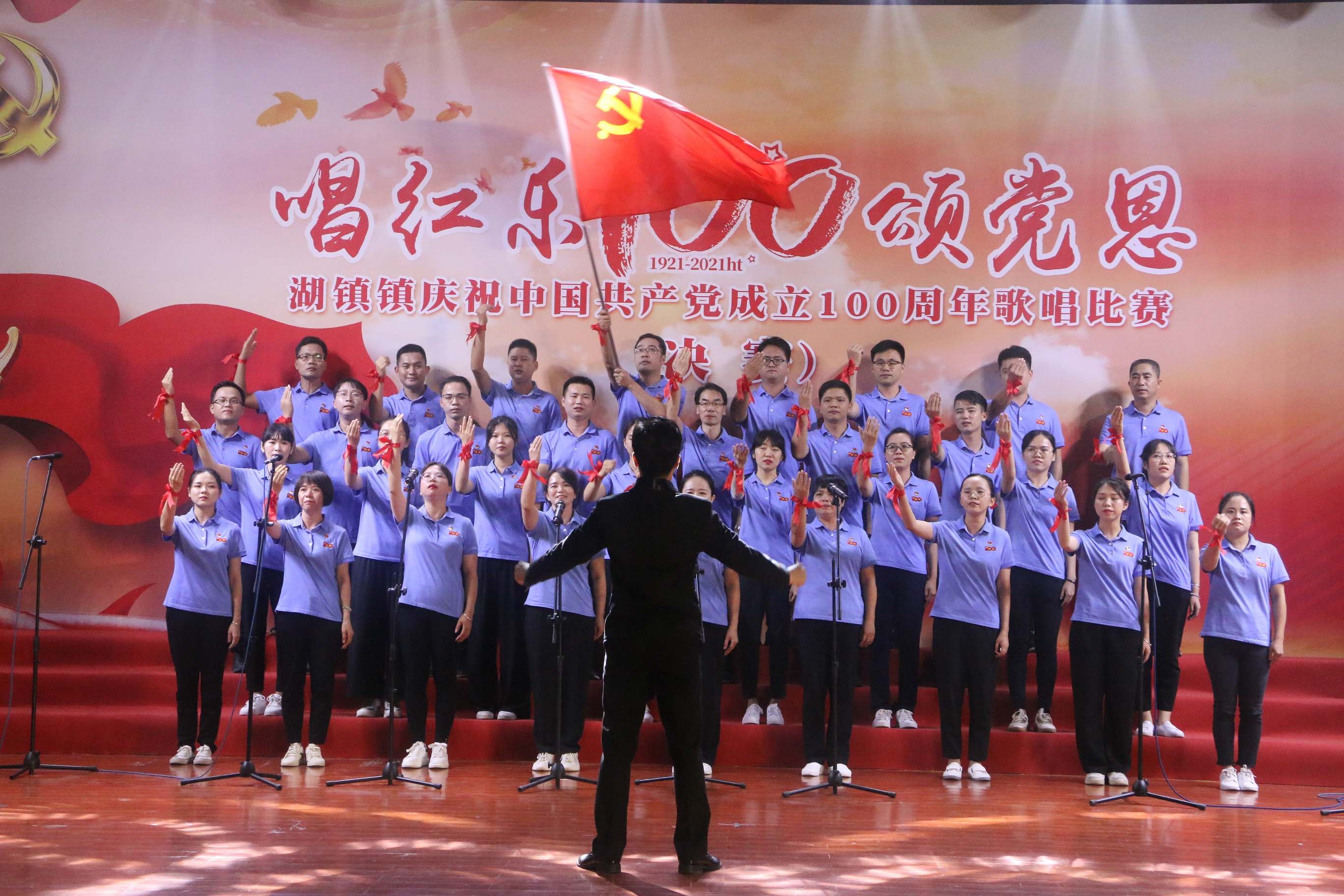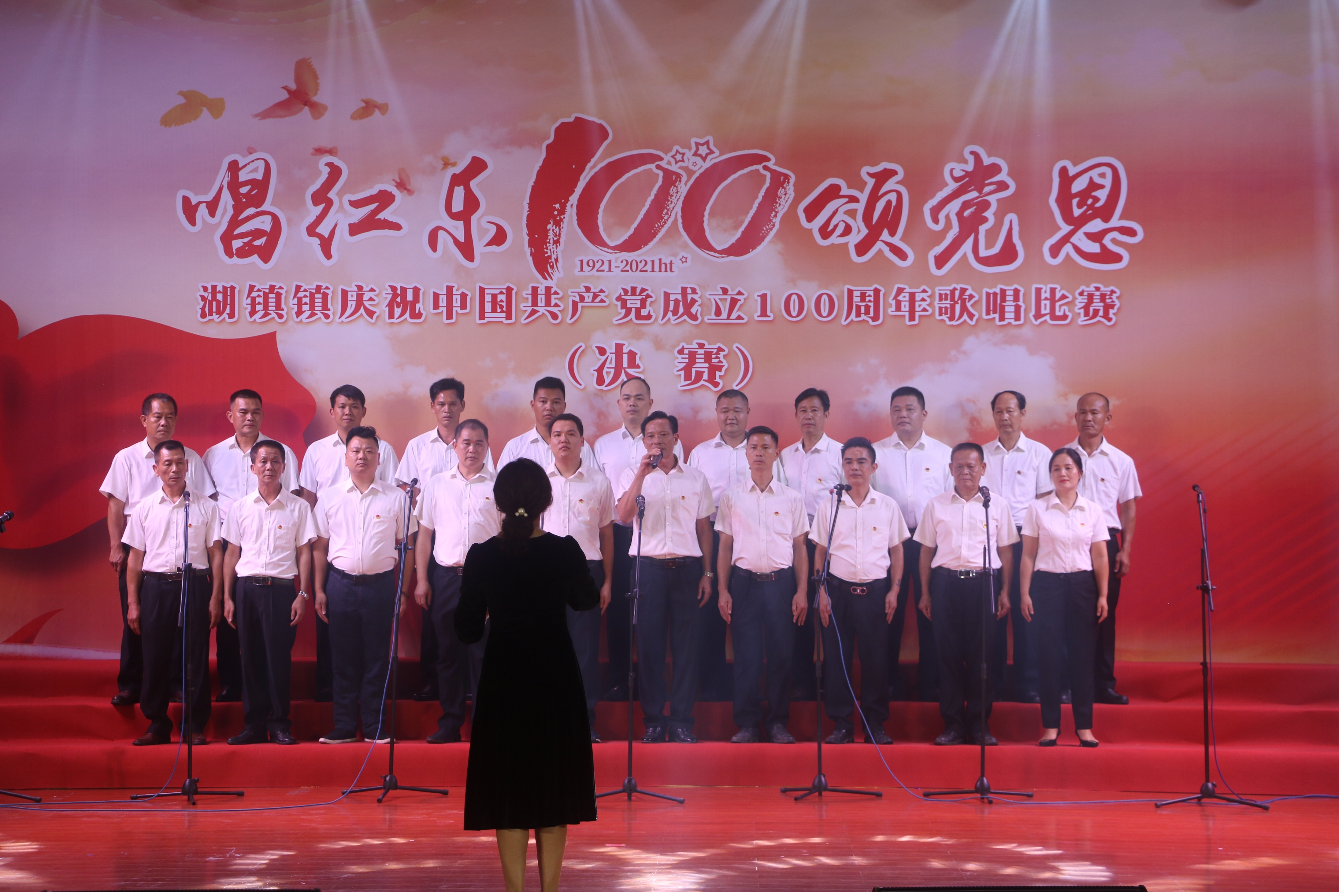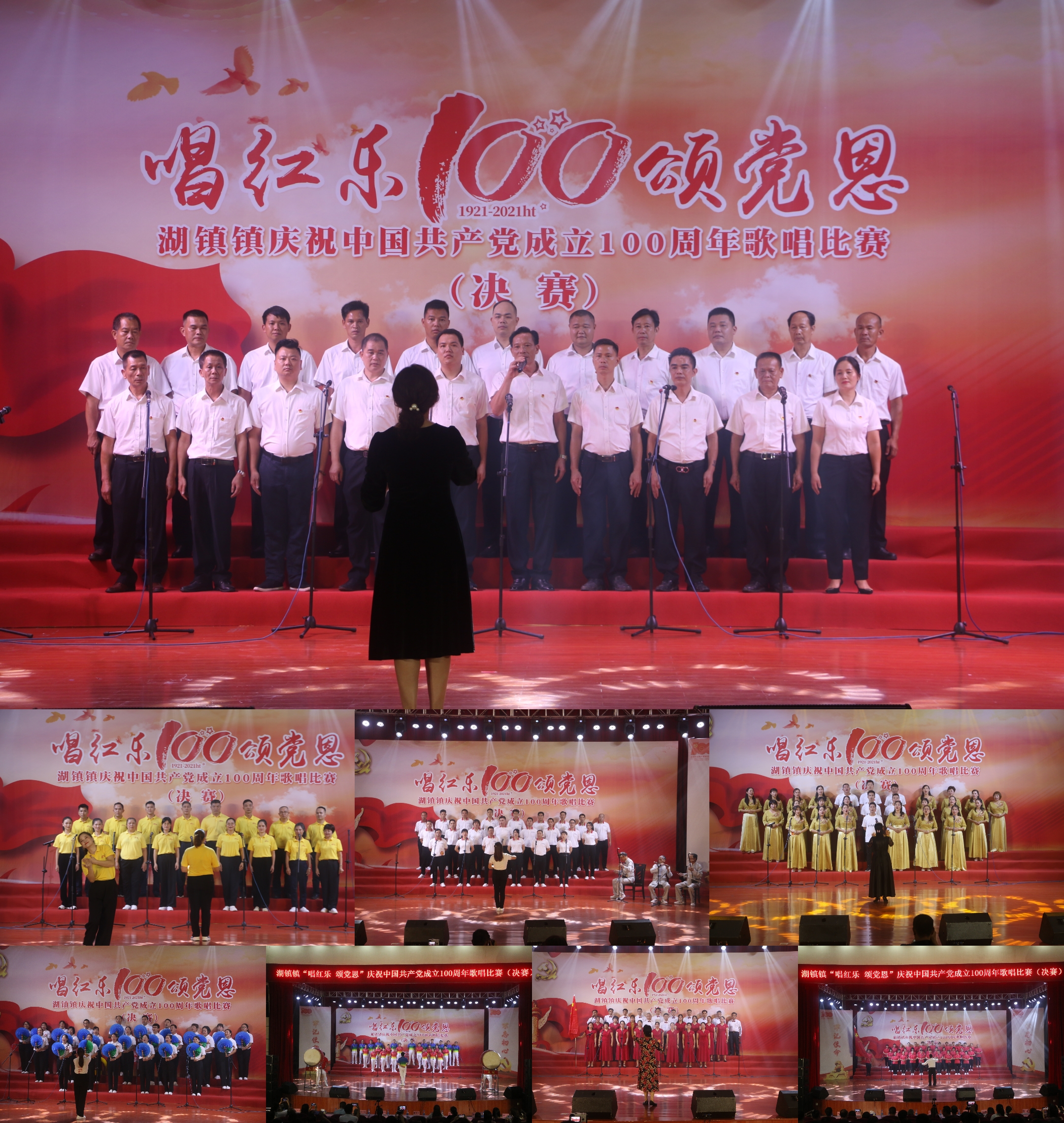 此次"唱红乐,颂党恩"庆祝中国共产党成立100周年歌唱比赛是我镇党史学习教育"七个100"系列活动之一。自今年4月开始,全镇共有44支参赛队伍积极响应,动员号召5000多名党员和群众参与活动。决赛当晚,各参赛队伍精选红乐曲目,结合湖镇特色,利用各种乐曲伴奏,采用歌舞表演、多声部合唱等形式,以饱满的热情和动人的歌声让在场的观众享受到一场好看又好听的演出。让我们回顾一下决赛当晚的精彩瞬间。