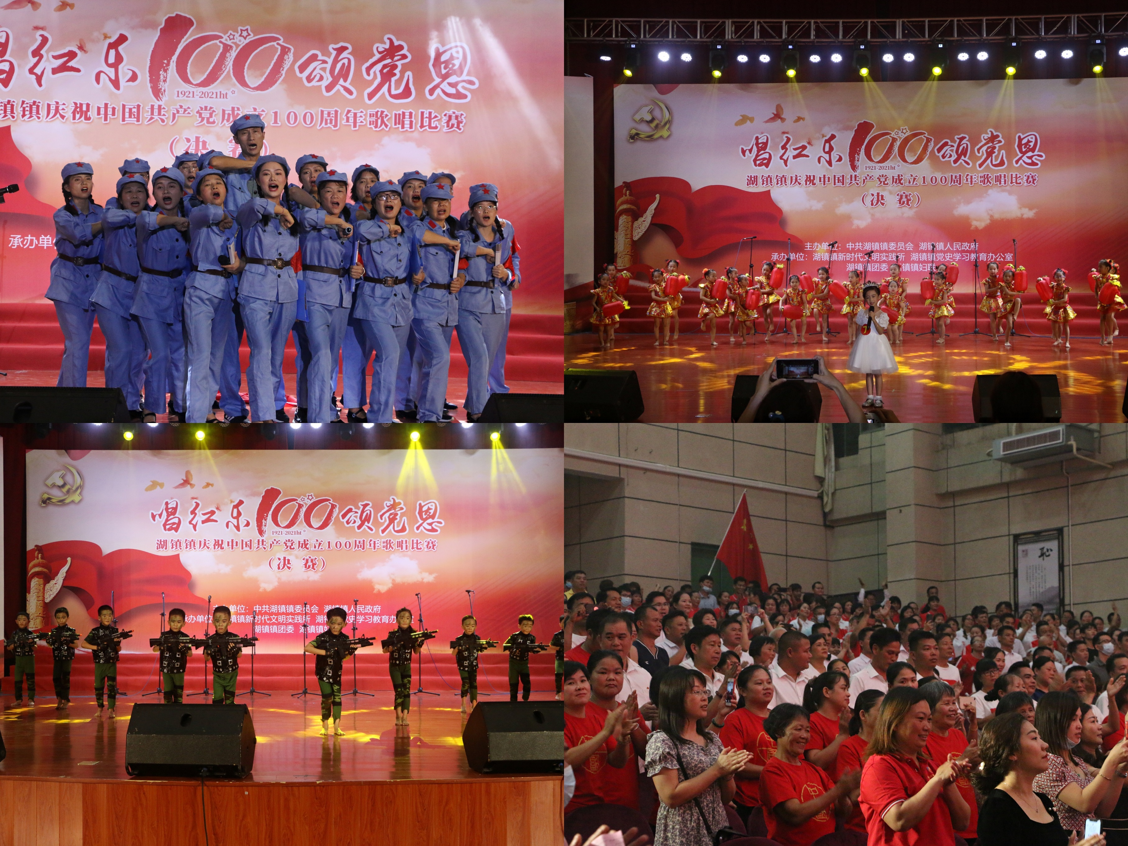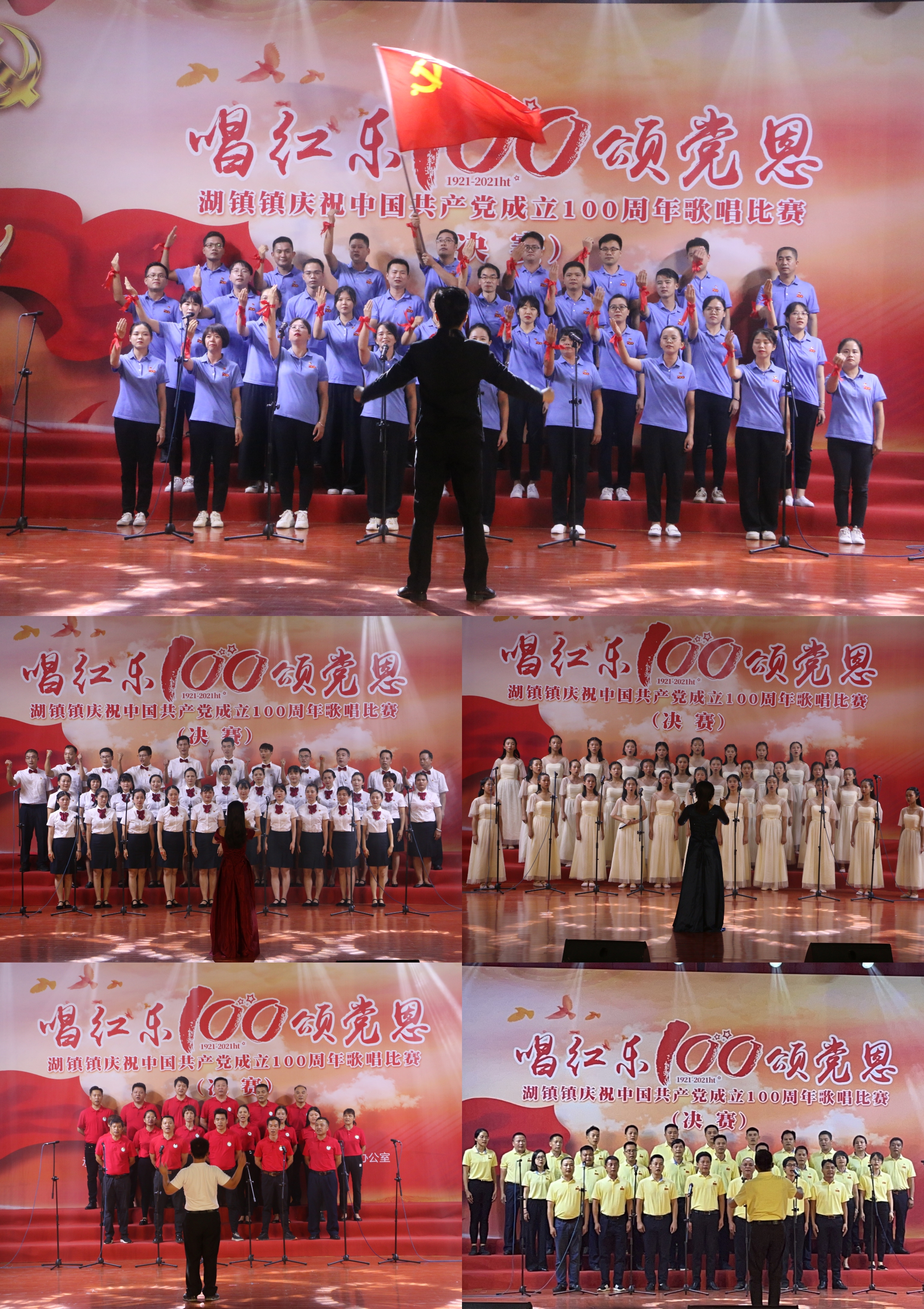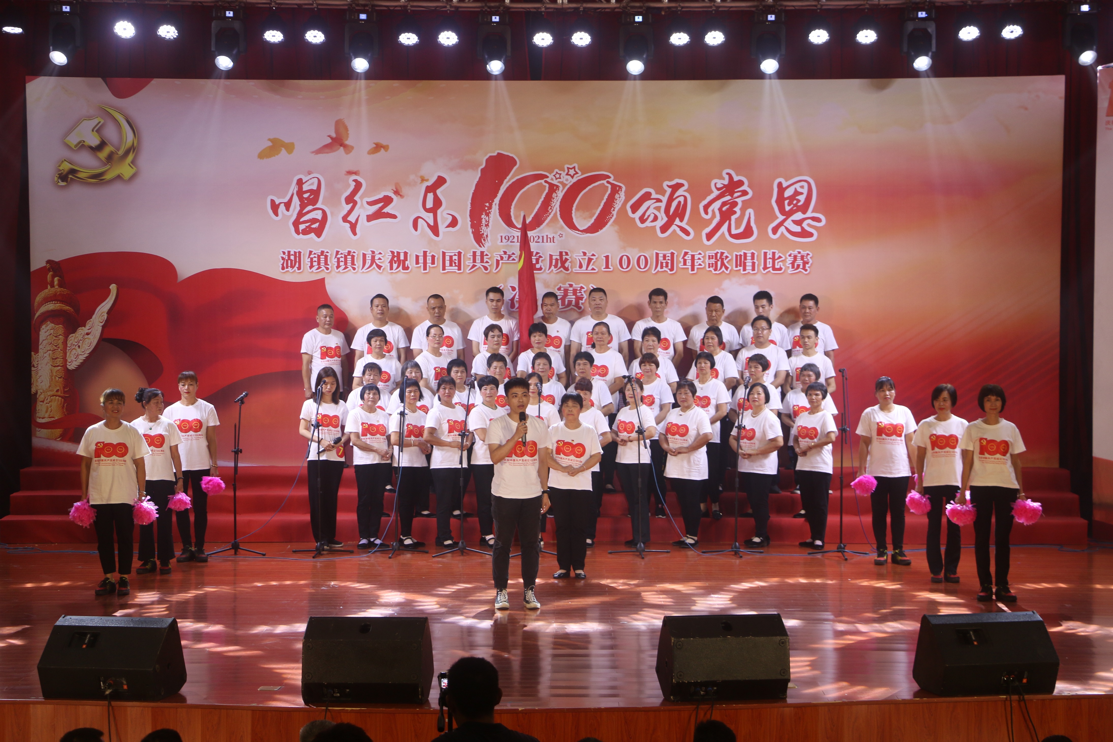 此次"唱红乐,颂党恩"庆祝中国共产党成立100周年歌唱比赛是我镇党史学习教育"七个100"系列活动之一。自今年4月开始,全镇共有44支参赛队伍积极响应,动员号召5000多名党员和群众参与活动。决赛当晚,各参赛队伍精选红乐曲目,结合湖镇特色,利用各种乐曲伴奏,采用歌舞表演、多声部合唱等形式,以饱满的热情和动人的歌声让在场的观众享受到一场好看又好听的演出。让我们回顾一下决赛当晚的精彩瞬间。