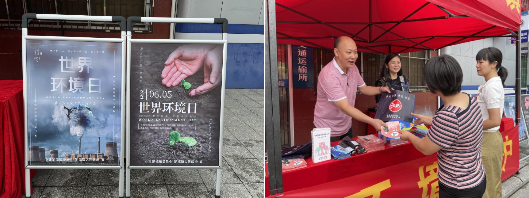 在世界环境日的主题宣传活动中,湖镇镇紧紧围绕“人与自然和谐共生”,通过悬挂宣传标语、张贴海报、发放环保宣传册、环保小知识有奖问答等方式开展了环保宣传活动。镇委副书记、镇长刘伟荣、镇委委员张子良一同参加活动。