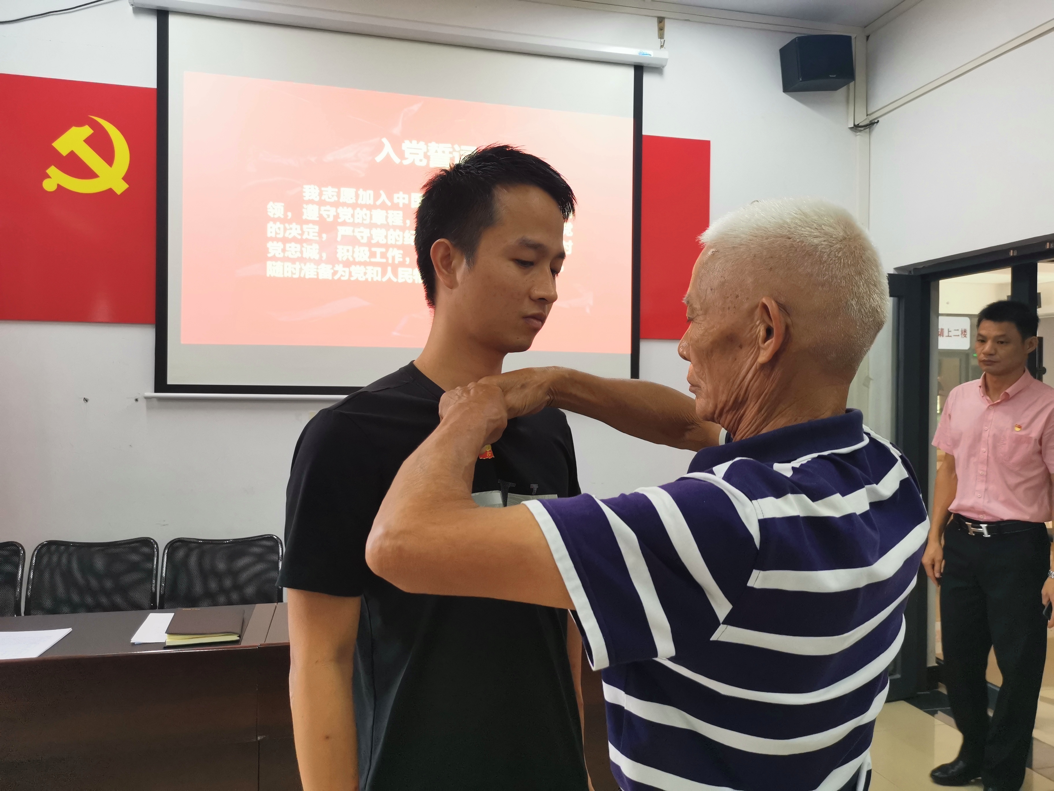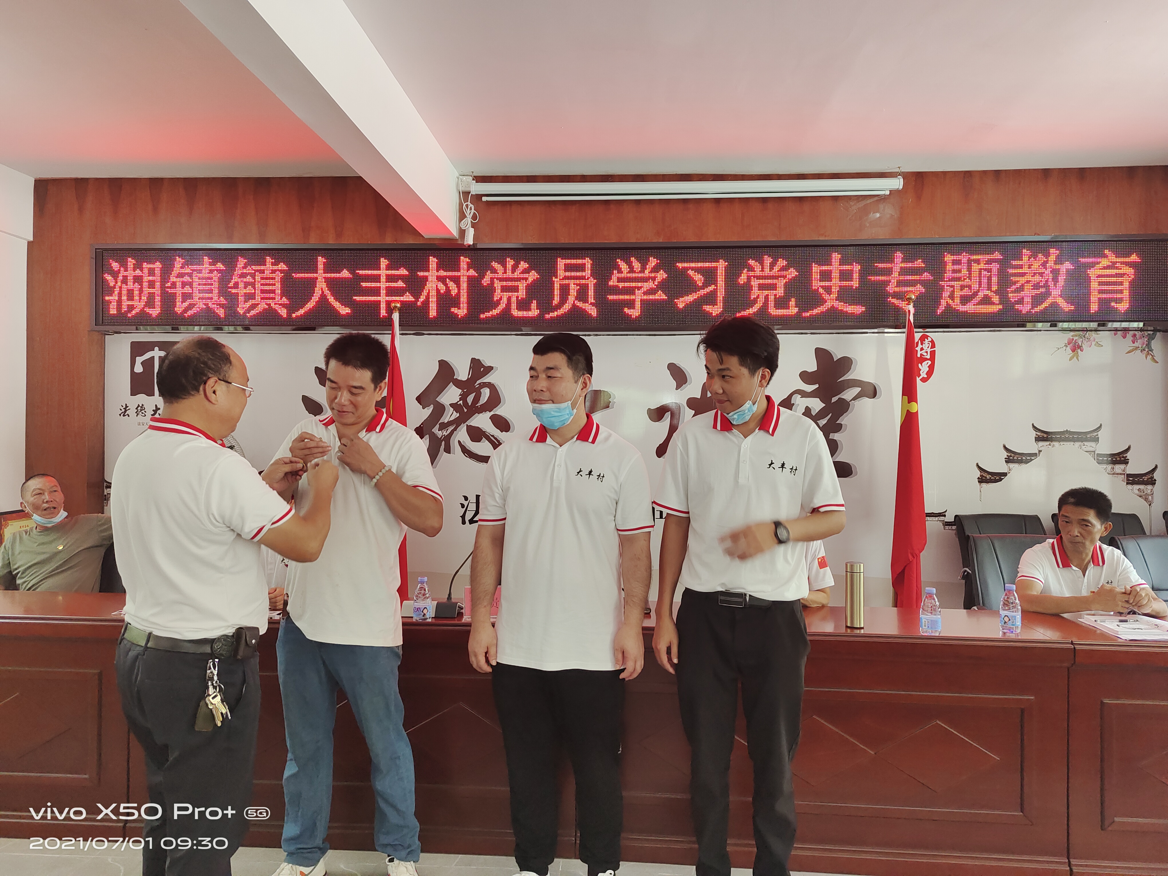 在湖镇镇大丰村,支部书记冯贵寿也为今年转正的党员和新吸收的预备党员安排了一样别样的仪式。宣誓前,支部书记冯贵寿亲自为他们带上党徽。他说,党徽虽然不重,却有万丈光芒,带上它是沉甸甸的,希望他们能够感受到作为党员身上肩负的责任与使命,能够传承初心,继续奋斗。