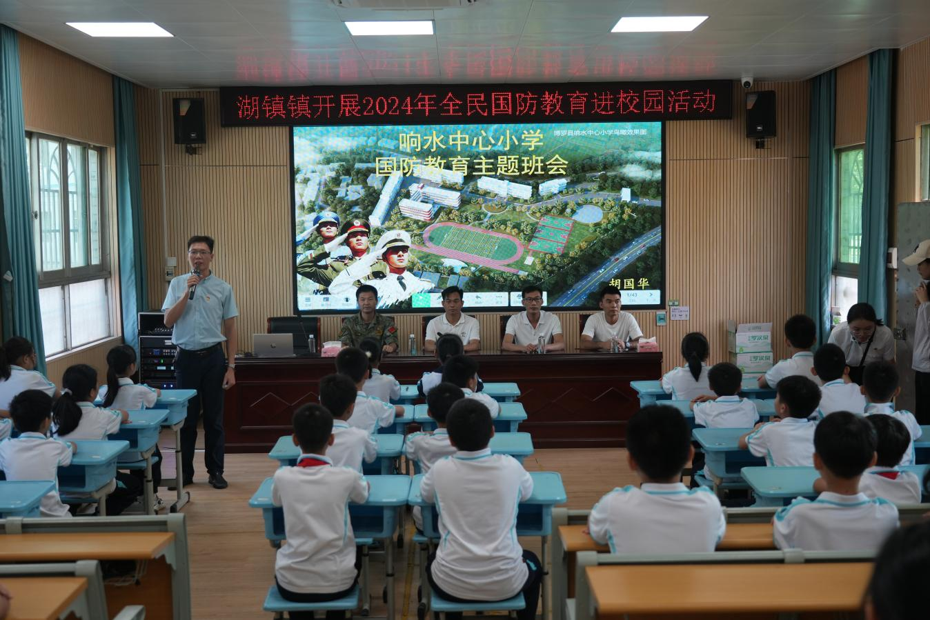 为深入普及国防知识,进一步提升青少年儿童对国防知识的了解和认识,增强他们的爱国意识和国防观念,湖镇镇多部门联动,联合响水中心小学开展了2024年全民国防教育进校园活动,镇武装部、党群服务中心、退役军人服务站、公共服务办科学教育组、志愿者、响水中心小学相关领导及响水中心小学师生共百余人参与了此次活动。